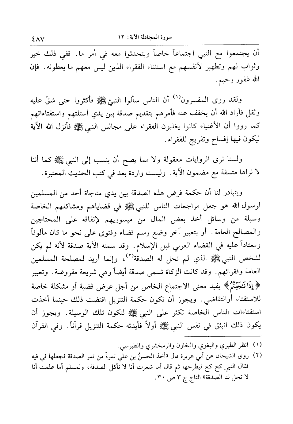 ويتبادر لنا أن حكمة فرض هذه الصدقة بين يدي مناجاة أحد من المسلمين لرسول الله هو جعل مراجعات الناس للنبي صلى الله عليه وسلم في قضاياهم ومشاكلهم الخاصة وسيلة من وسائل أخذ بعض المال من ميسوريهم لإنفاقه على المحتاجين والمصالح العامة. أو بتعبير آخر وضع رسم قضاء وفتوى على نحو ما كان مألوفا ومعتادا عليه في القضاء العربي قبل الإسلام. وقد سمته الآية صدقة لأنه لم يكن لشخص النبي صلى الله عليه وسلم الذي لم تحل له الصدقة «2» ، وإنما أريد لمصلحة المسلمين العامة وفقرائهم. وقد كانت الزكاة تسمى صدقة أيضا وهي شريعة مفروضة. وتعبير إِذا ناجَيْتُمُ يفيد معنى الاجتماع الخاص من أجل عرض قضية أو مشكلة خاصة للاستفتاء أو التقاضي. ويجوز أن تكون حكمة التنزيل اقتضت ذلك حينما أخذت استفتاءات الناس الخاصة تكثر على النبي صلى الله عليه وسلم لتكون تلك الوسيلة. ويجوز أن يكون ذلك انبثق في نفس النبي صلى الله عليه وسلم أولا فأيدته حكمة التنزيل قرآنا. وفي القرآن