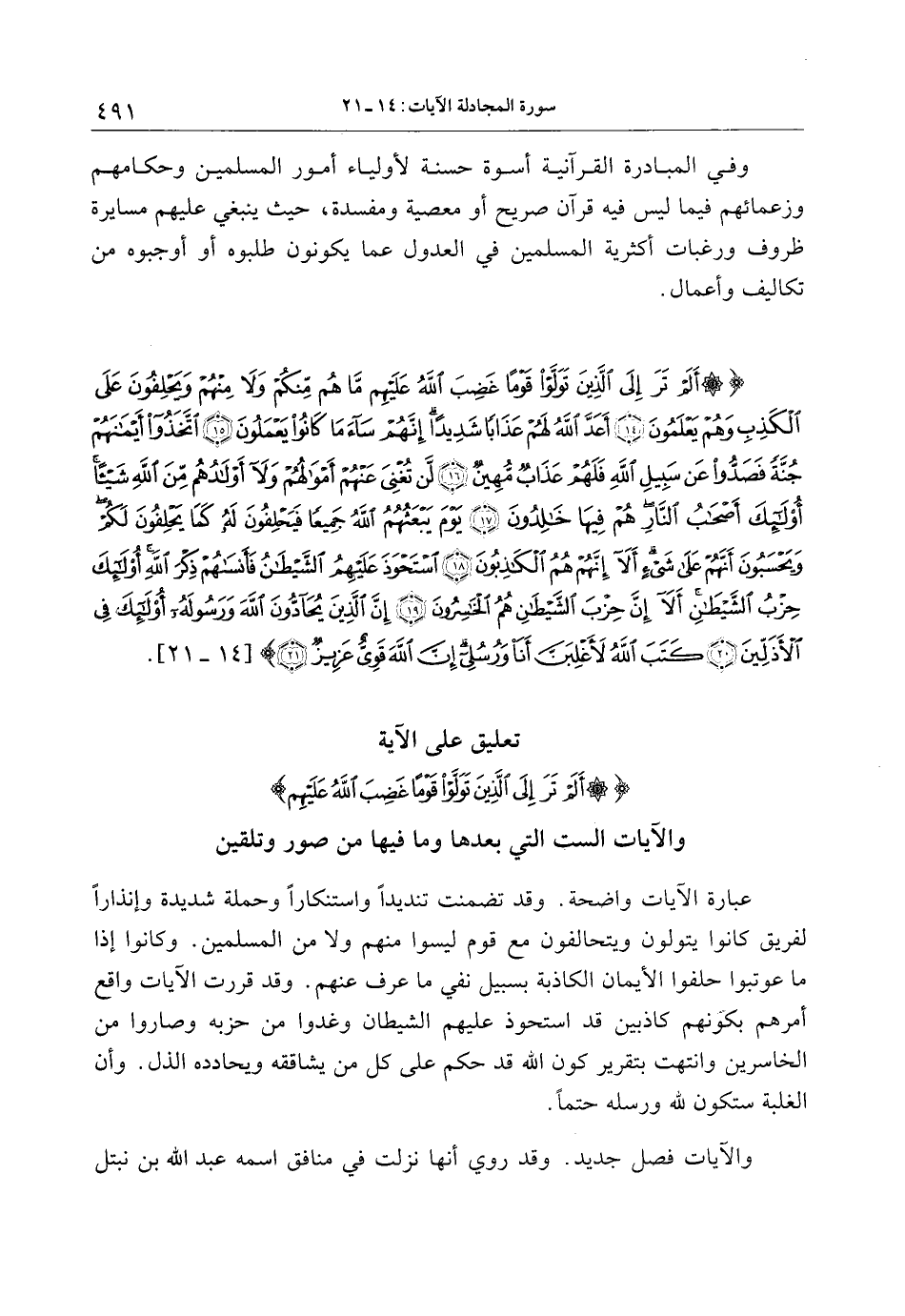 . تعليق على الآية أَلَمْ تَرَ إِلَى الَّذِينَ تَوَلَّوْا قَوْماً غَضِبَ اللَّهُ عَلَيْهِمْ والآيات الست التي بعدها وما فيها من صور وتلقين