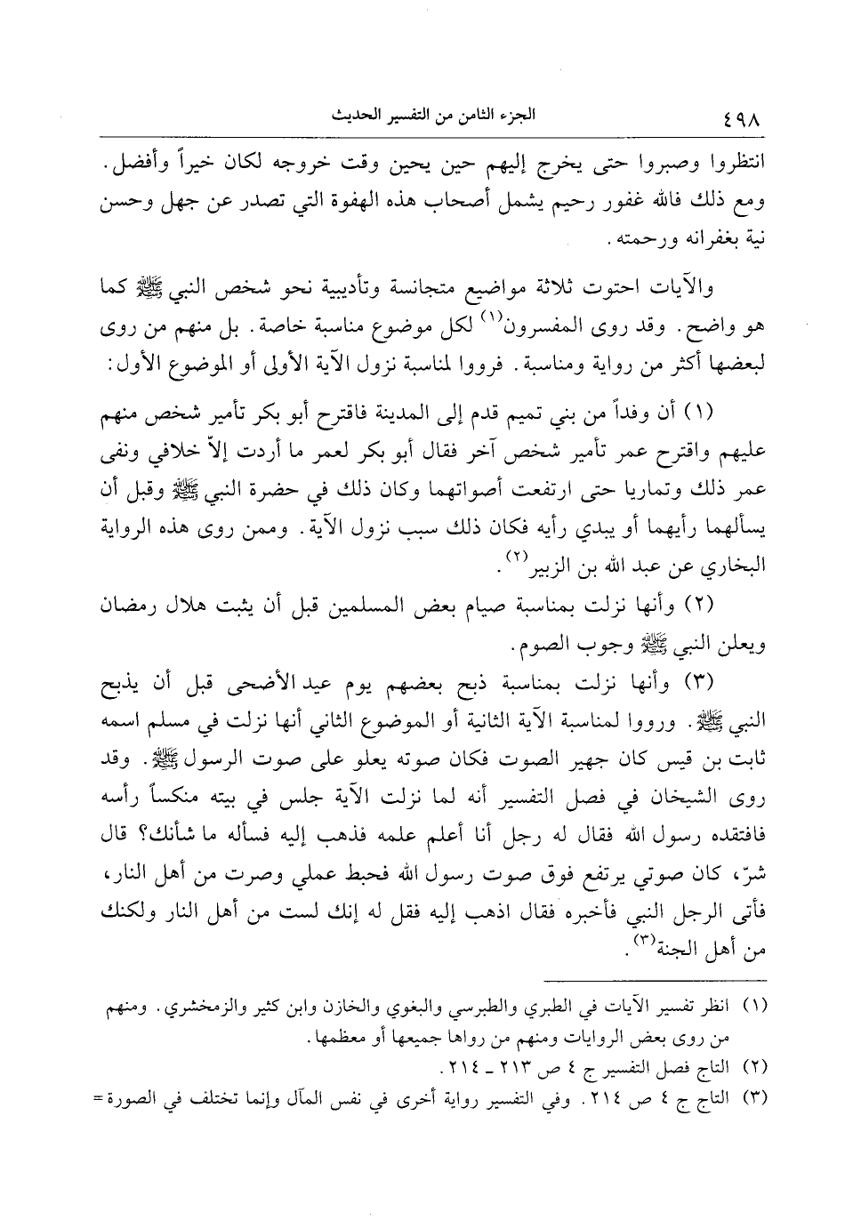 (3) وأنها نزلت بمناسبة ذبح بعضهم يوم عيد الأضحى قبل أن يذبح النبي صلى الله عليه وسلم. ورووا لمناسبة الآية الثانية أو الموضوع الثاني أنها نزلت في مسلم اسمه ثابت بن قيس كان جهير الصوت فكان صوته يعلو على صوت الرسول صلى الله عليه وسلم. وقد روى الشيخان في فصل التفسير أنه لما نزلت الآية جلس في بيته منكسا رأسه فافتقده رسول الله فقال له رجل أنا أعلم علمه فذهب إليه فسأله ما شأنك؟ قال شرّ، كان صوتي يرتفع فوق صوت رسول الله فحبط عملي وصرت من أهل النار، فأتى الرجل النبي فأخبره فقال اذهب إليه فقل له إنك لست من أهل النار ولكنك من أهل الجنة «3» .