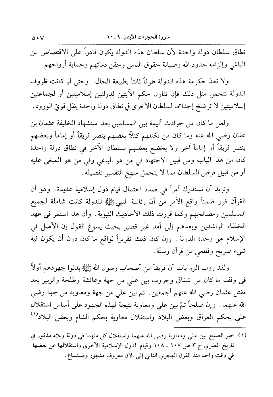 ولعل ما كان من حوادث أليمة بين المسلمين بعد استشهاد الخليفة عثمان بن عفان رضي الله عنه وما كان من تكتلهم كتلا بعضهم ينصر فريقا أو إماما وبعضهم ينصر فريقا أو إماما آخر ولا يخضع بعضهم لسلطان الآخر في نطاق دولة واحدة كان من هذا الباب ومن قبيل الاجتهاد في من هو الباغي وفي من هو المبغى عليه أو من قبيل فرض السلطان مما لا يتحمل منهج التفسير تفصيله.