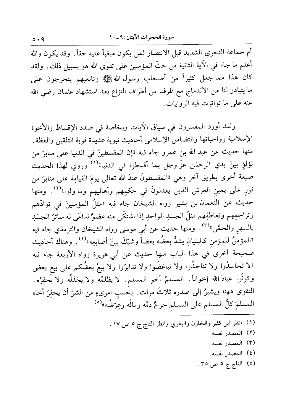 ولقد أورد المفسرون في سياق الآيات وبخاصة في صدد الإقساط والأخوة الإسلامية وواجباتها والتضامن الإسلامي أحاديث نبوية عديدة قوية التلقين والعظة.