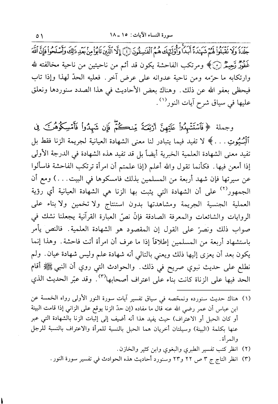 (1) هناك حديث سنورده ونمحّصه في سياق تفسير آيات سورة النور الأولى رواه الخمسة عن ابن عباس أن عمر رضي الله عنه قال ما مفاده (إن حدّ الزنا يوقع على الزاني إذا قامت البينة أو كان الحبل أو الاعتراف) حيث يفيد هذا أنه أضيف إلى إثبات الزنا بالشهادة التي عبر عنها بكلمة (البينة) وسيلتان أخريان هما الحبل بالنسبة للمرأة والاعتراف بالنسبة للرجل والمرأة.