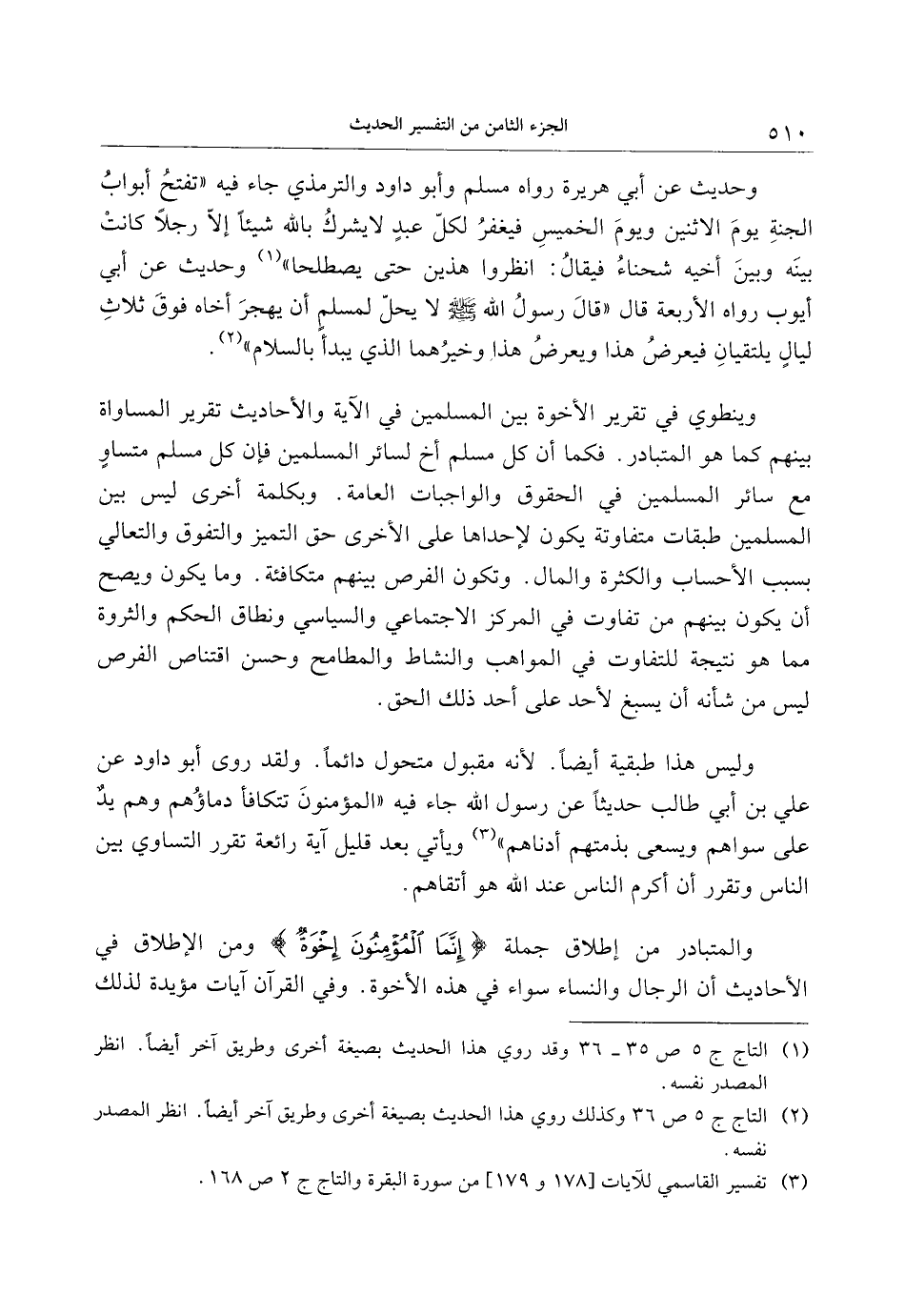 وينطوي في تقرير الأخوة بين المسلمين في الآية والأحاديث تقرير المساواة بينهم كما هو المتبادر. فكما أن كل مسلم أخ لسائر المسلمين فإن كل مسلم متساو مع سائر المسلمين في الحقوق والواجبات العامة. وبكلمة أخرى ليس بين المسلمين طبقات متفاوتة يكون لإحداها على الأخرى حق التميز والتفوق والتعالي بسبب الأحساب والكثرة والمال. وتكون الفرص بينهم متكافئة. وما يكون ويصح أن يكون بينهم من تفاوت في المركز الاجتماعي والسياسي ونطاق الحكم والثروة مما هو نتيجة للتفاوت في المواهب والنشاط والمطامح وحسن اقتناص الفرص ليس من شأنه أن يسبغ لأحد على أحد ذلك الحق.