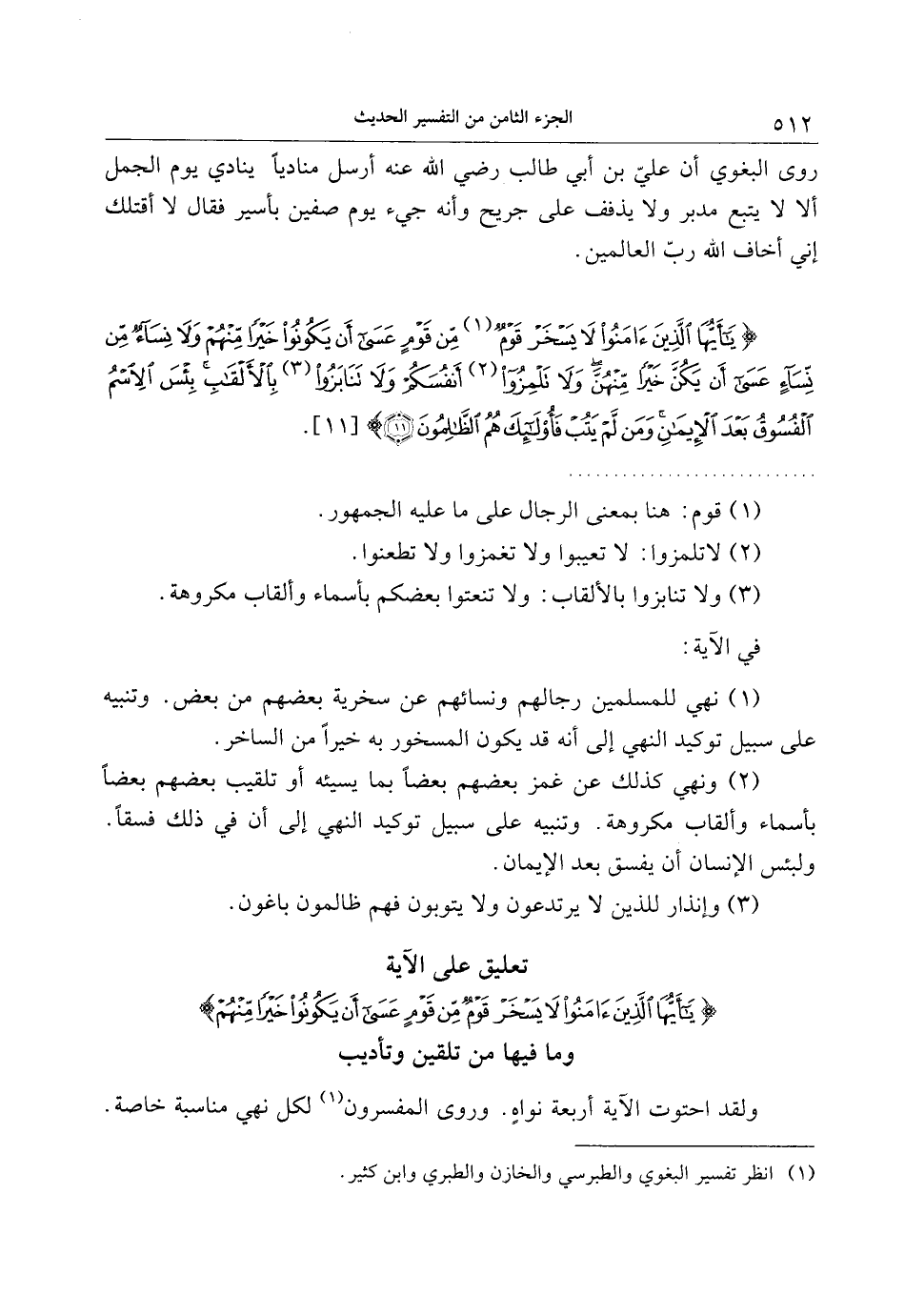 تعليق على الآية يا أَيُّهَا الَّذِينَ آمَنُوا لا يَسْخَرْ قَوْمٌ مِنْ قَوْمٍ عَسى أَنْ يَكُونُوا خَيْراً مِنْهُمْ وما فيها من تلقين وتأديب