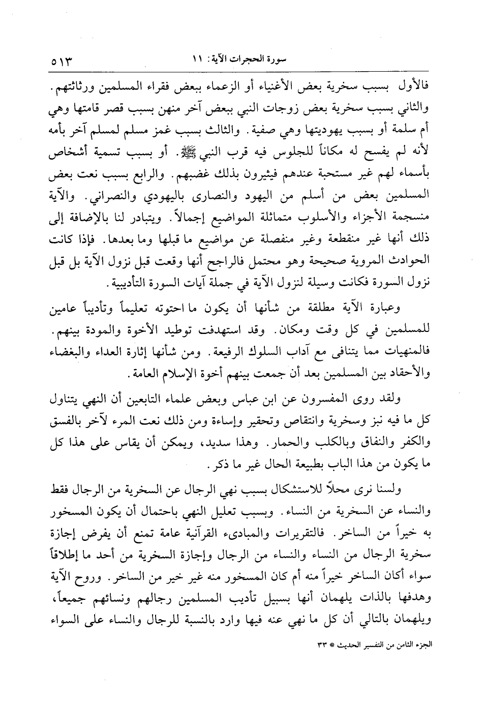 ولسنا نرى محلا للاستشكال بسبب نهي الرجال عن السخرية من الرجال فقط والنساء عن السخرية من النساء. وبسبب تعليل النهي باحتمال أن يكون المسخور به خيرا من الساخر. فالتقريرات والمبادئ القرآنية عامة تمنع أن يفرض إجازة سخرية الرجال من النساء والنساء من الرجال وإجازة السخرية من أحد ما إطلاقا سواء أكان الساخر خيرا منه أم كان المسخور منه غير خير من الساخر. وروح الآية وهدفها بالذات يلهمان أنها بسبيل تأديب المسلمين رجالهم ونسائهم جميعا، ويلهمان بالتالي أن كل ما نهي عنه فيها وارد بالنسبة للرجال والنساء على السواء الجزء الثامن من التفسير الحديث 33