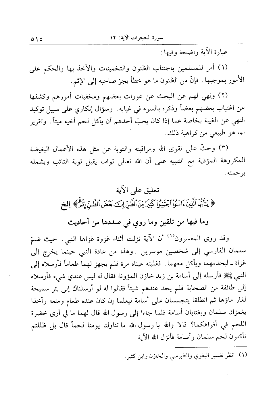 (1) أمر للمسلمين باجتناب الظنون والتخمينات والأخذ بها والحكم على الأمور بموجبها. فإنّ من الظنون ما هو خطأ يجرّ صاحبه إلى الإثم.