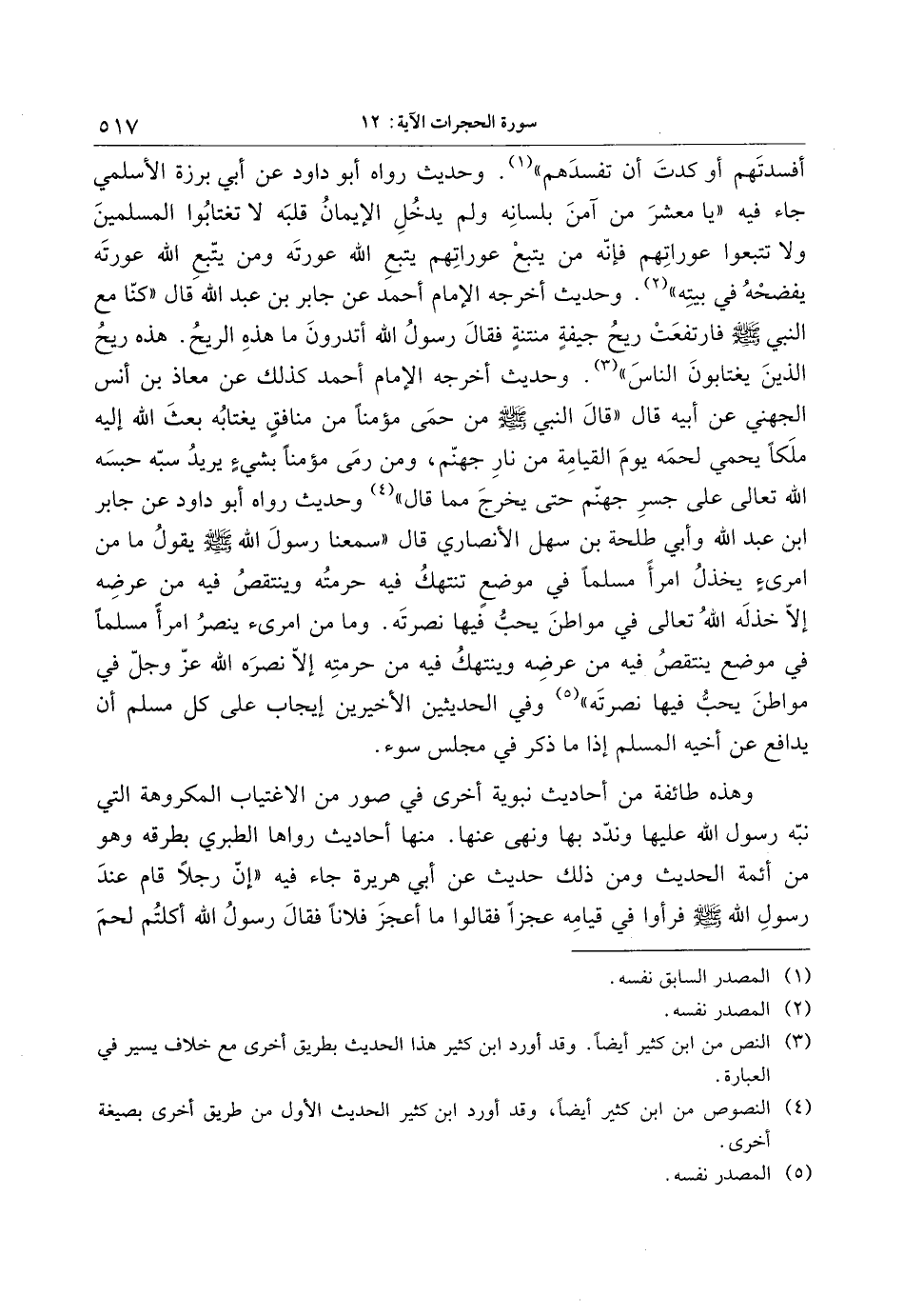 أفسدتهم أو كدت أن تفسدهم» «1» . وحديث رواه أبو داود عن أبي برزة الأسلمي جاء فيه «يا معشر من آمن بلسانه ولم يدخل الإيمان قلبه لا تغتابوا المسلمين ولا تتبعوا عوراتهم فإنّه من يتبع عوراتهم يتبع الله عورته ومن يتّبع الله عورته يفضحه في بيته» «2» . وحديث أخرجه الإمام أحمد عن جابر بن عبد الله قال «كنّا مع النبي صلى الله عليه وسلم فارتفعت ريح جيفة منتنة فقال رسول الله أتدرون ما هذه الريح. هذه ريح الذين يغتابون الناس» «3» . وحديث أخرجه الإمام أحمد كذلك عن معاذ بن أنس الجهني عن أبيه قال «قال النبي صلى الله عليه وسلم من حمى مؤمنا من منافق يغتابه بعث الله إليه ملكا يحمي لحمه يوم القيامة من نار جهنّم، ومن رمى مؤمنا بشيء يريد سبّه حبسه الله تعالى على جسر جهنّم حتى يخرج مما قال» «4» وحديث رواه أبو داود عن جابر ابن عبد الله وأبي طلحة بن سهل الأنصاري قال «سمعنا رسول الله صلى الله عليه وسلم يقول ما من امرئ يخذل امرأ مسلما في موضع تنتهك فيه حرمته وينتقص فيه من عرضه إلّا خذله الله تعالى في مواطن يحبّ فيها نصرته. وما من امرئ ينصر امرأ مسلما في موضع ينتقص فيه من عرضه وينتهك فيه من حرمته إلّا نصره الله عزّ وجلّ في مواطن يحبّ فيها نصرته» «5» وفي الحديثين الأخيرين إيجاب على كل مسلم أن يدافع عن أخيه المسلم إذا ما ذكر في مجلس سوء.