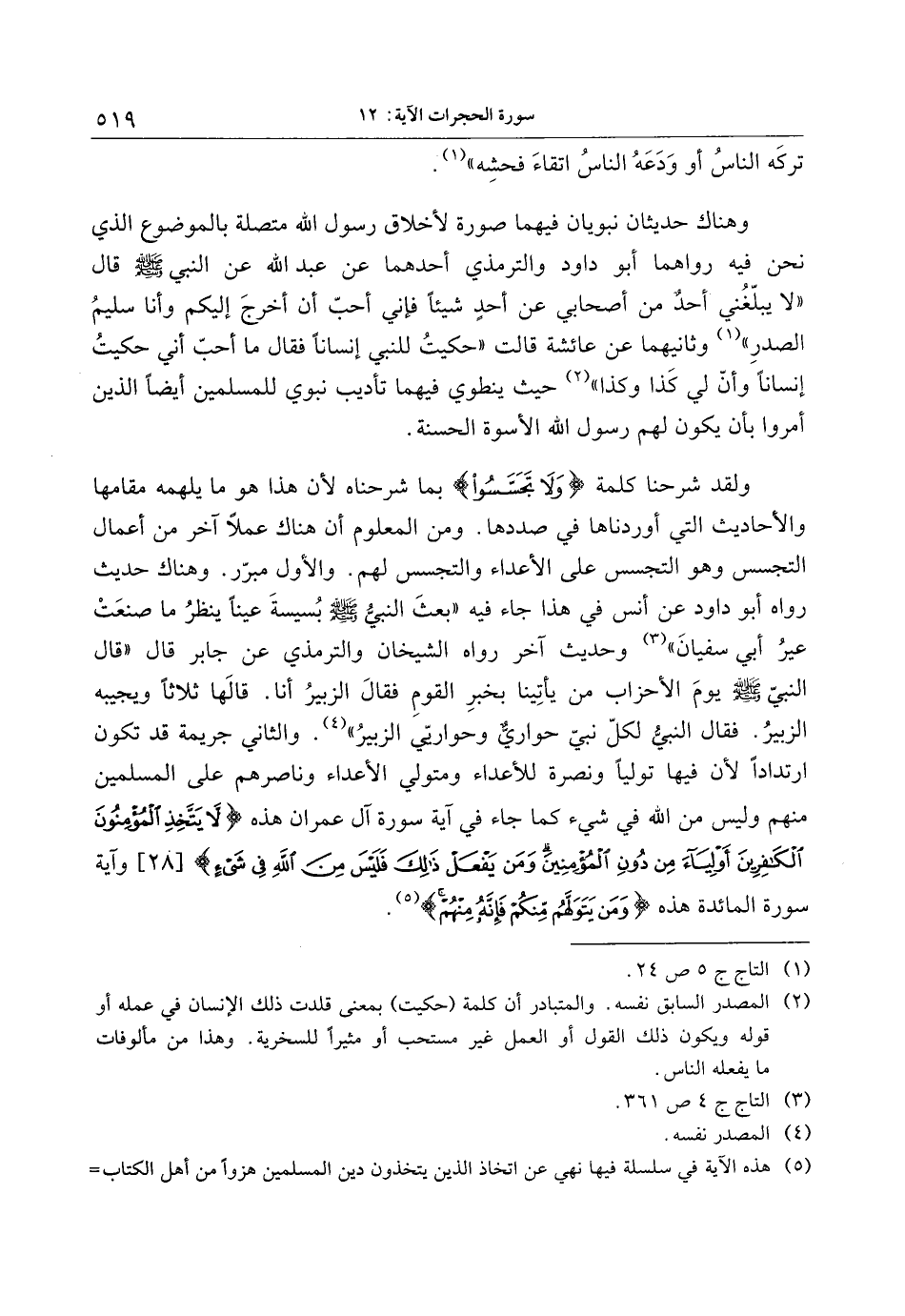 ولقد شرحنا كلمة وَلا تَجَسَّسُوا بما شرحناه لأن هذا هو ما يلهمه مقامها والأحاديث التي أوردناها في صددها. ومن المعلوم أن هناك عملا آخر من أعمال التجسس وهو التجسس على الأعداء والتجسس لهم. والأول مبرّر. وهناك حديث رواه أبو داود عن أنس في هذا جاء فيه «بعث النبيّ صلى الله عليه وسلم بسيسة عينا ينظر ما صنعت عير أبي سفيان» «4» وحديث آخر رواه الشيخان والترمذي عن جابر قال «قال النبيّ صلى الله عليه وسلم يوم الأحزاب من يأتينا بخبر القوم فقال الزبير أنا. قالها ثلاثا ويجيبه الزبير. فقال النبيّ لكلّ نبيّ حواريّ وحواريّي الزبير» «5» . والثاني جريمة قد تكون ارتدادا لأن فيها توليا ونصرة للأعداء ومتولي الأعداء وناصرهم على المسلمين منهم وليس من الله في شيء كما جاء في آية سورة آل عمران هذه لا يَتَّخِذِ الْمُؤْمِنُونَ الْكافِرِينَ أَوْلِياءَ مِنْ دُونِ الْمُؤْمِنِينَ وَمَنْ يَفْعَلْ ذلِكَ فَلَيْسَ مِنَ اللَّهِ فِي شَيْءٍ [28] وآية سورة المائدة هذه وَمَنْ يَتَوَلَّهُمْ مِنْكُمْ فَإِنَّهُ مِنْهُمْ «6» .