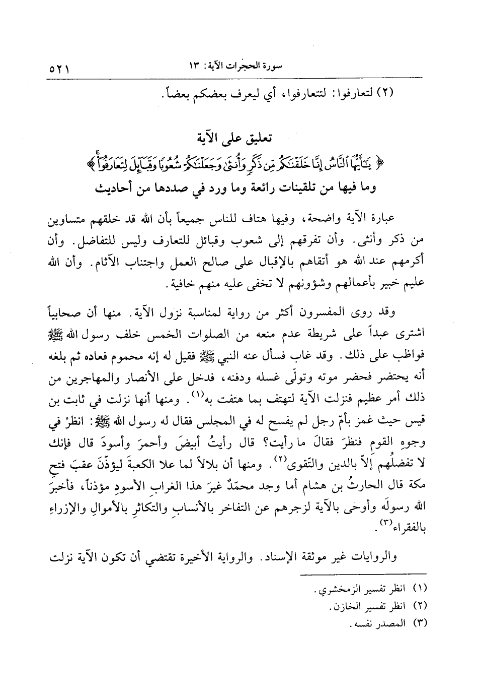 تعليق على الآية يا أَيُّهَا النَّاسُ إِنَّا خَلَقْناكُمْ مِنْ ذَكَرٍ وَأُنْثى وَجَعَلْناكُمْ شُعُوباً وَقَبائِلَ لِتَعارَفُوا وما فيها من تلقينات رائعة وما ورد في صددها من أحاديث