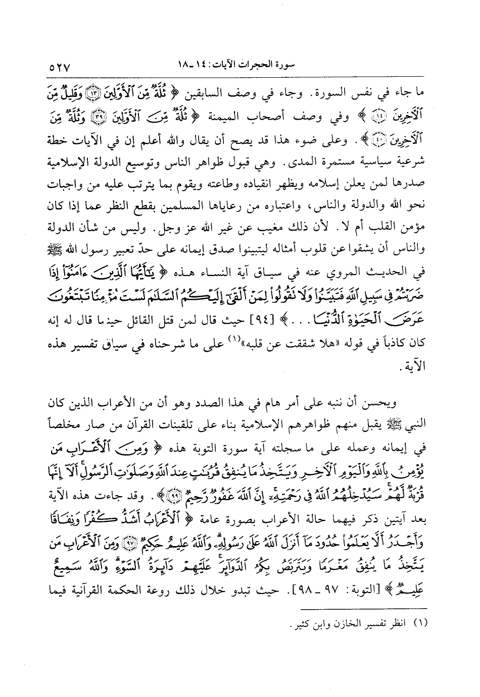 ما جاء في نفس السورة. وجاء في وصف السابقين ثُلَّةٌ مِنَ الْأَوَّلِينَ (13) وَقَلِيلٌ مِنَ الْآخِرِينَ (14) وفي وصف أصحاب الميمنة ثُلَّةٌ مِنَ الْأَوَّلِينَ (39) وَثُلَّةٌ مِنَ الْآخِرِينَ (40) . وعلى ضوء هذا قد يصح أن يقال والله أعلم إن في الآيات خطة شرعية سياسية مستمرة المدى. وهي قبول ظواهر الناس وتوسيع الدولة الإسلامية صدرها لمن يعلن إسلامه ويظهر انقياده وطاعته ويقوم بما يترتب عليه من واجبات نحو الله والدولة والناس، واعتباره من رعاياها المسلمين بقطع النظر عما إذا كان مؤمن القلب أم لا. لأن ذلك مغيب عن غير الله عز وجل. وليس من شأن الدولة والناس أن يشقوا عن قلوب أمثاله ليتبينوا صدق إيمانه على حدّ تعبير رسول الله صلى الله عليه وسلم في الحديث المروي عنه في سياق آية النساء هذه يا أَيُّهَا الَّذِينَ آمَنُوا إِذا ضَرَبْتُمْ فِي سَبِيلِ اللَّهِ فَتَبَيَّنُوا وَلا تَقُولُوا لِمَنْ أَلْقى إِلَيْكُمُ السَّلامَ لَسْتَ مُؤْمِناً تَبْتَغُونَ عَرَضَ الْحَياةِ الدُّنْيا ... [94] حيث قال لمن قتل القائل حينما قال له إنه كان كاذبا في قوله «هلا شققت عن قلبه» «1» على ما شرحناه في سياق تفسير هذه الآية.