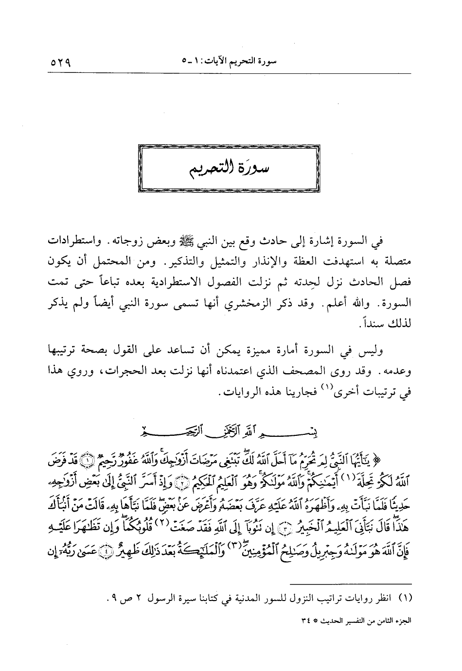 في السورة إشارة إلى حادث وقع بين النبي صلى الله عليه وسلم وبعض زوجاته. واستطرادات متصلة به استهدفت العظة والإنذار والتمثيل والتذكير. ومن المحتمل أن يكون فصل الحادث نزل لحدته ثم نزلت الفصول الاستطرادية بعده تباعا حتى تمت السورة. والله أعلم. وقد ذكر الزمخشري أنها تسمى سورة النبي أيضا ولم يذكر لذلك سندا.
