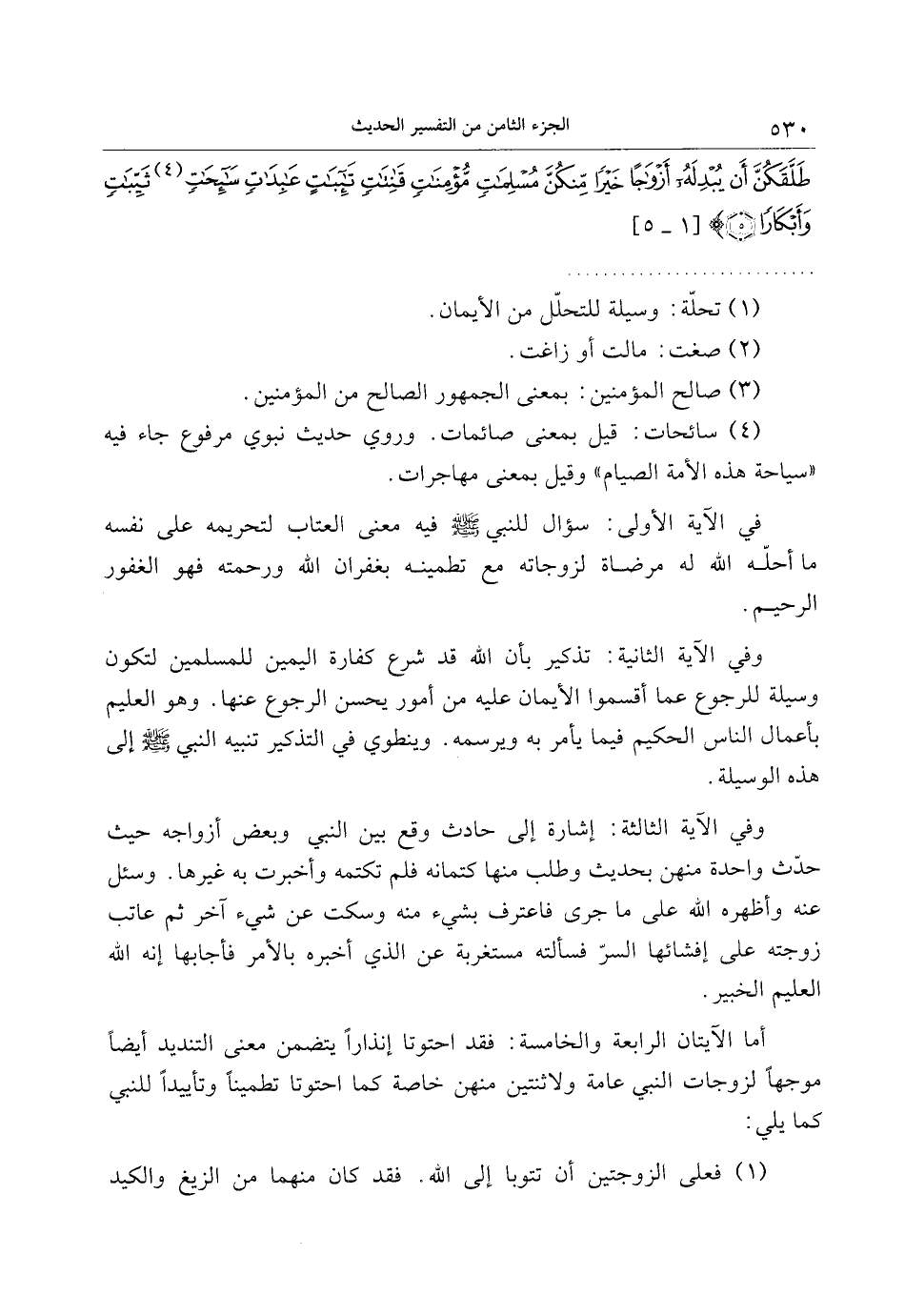(4) سائحات: قيل بمعنى صائمات. وروي حديث نبوي مرفوع جاء فيه «سياحة هذه الأمة الصيام» وقيل بمعنى مهاجرات.