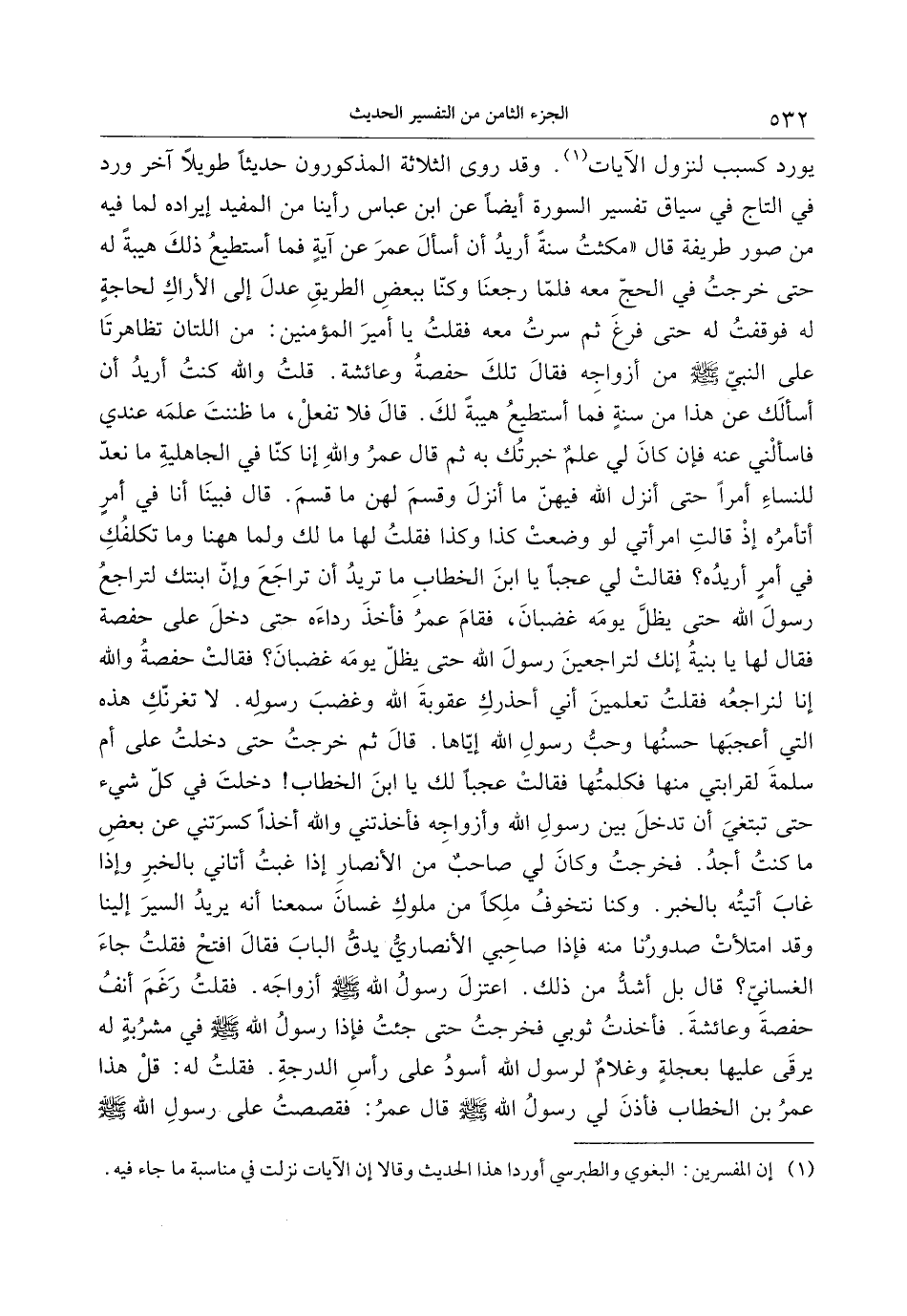 يورد كسبب لنزول الآيات «1» . وقد روى الثلاثة المذكورون حديثا طويلا آخر ورد في التاج في سياق تفسير السورة أيضا عن ابن عباس رأينا من المفيد إيراده لما فيه من صور طريفة قال «مكثت سنة أريد أن أسأل عمر عن آية فما أستطيع ذلك هيبة له حتى خرجت في الحجّ معه فلمّا رجعنا وكنّا ببعض الطريق عدل إلى الأراك لحاجة له فوقفت له حتى فرغ ثم سرت معه فقلت يا أمير المؤمنين: من اللتان تظاهرتا على النبيّ صلى الله عليه وسلم من أزواجه فقال تلك حفصة وعائشة. قلت والله كنت أريد أن أسألك عن هذا من سنة فما أستطيع هيبة لك. قال فلا تفعل، ما ظننت علمه عندي فاسألني عنه فإن كان لي علم خبرتك به ثم قال عمر والله إنا كنّا في الجاهلية ما نعدّ للنساء أمرا حتى أنزل الله فيهنّ ما أنزل وقسم لهن ما قسم. قال فبينا أنا في أمر أتأمره إذ قالت امرأتي لو وضعت كذا وكذا فقلت لها ما لك ولما هاهنا وما تكلفك في أمر أريده؟ فقالت لي عجبا يا ابن الخطاب ما تريد أن تراجع وإنّ ابنتك لتراجع رسول الله حتى يظلّ يومه غضبان، فقام عمر فأخذ رداءه حتى دخل على حفصة فقال لها يا بنية إنك لتراجعين رسول الله حتى يظلّ يومه غضبان؟ فقالت حفصة والله إنا لنراجعه فقلت تعلمين أني أحذرك عقوبة الله وغضب رسوله. لا تغرنّك هذه التي أعجبها حسنها وحبّ رسول الله إيّاها. قال ثم خرجت حتى دخلت على أم سلمة لقرابتي منها فكلمتها فقالت عجبا لك يا ابن الخطاب! دخلت في كلّ شيء حتى تبتغي أن تدخل بين رسول الله وأزواجه فأخذتني والله أخذا كسرتني عن بعض ما كنت أجد. فخرجت وكان لي صاحب من الأنصار إذا غبت أتاني بالخبر وإذا غاب أتيته بالخبر. وكنا نتخوف ملكا من ملوك غسان سمعنا أنه يريد السير إلينا وقد امتلأت صدورنا منه فإذا صاحبي الأنصاريّ يدقّ الباب فقال افتح فقلت جاء الغسانيّ؟ قال بل أشدّ من ذلك. اعتزل رسول الله صلى الله عليه وسلم أزواجه. فقلت رغم أنف حفصة وعائشة. فأخذت ثوبي فخرجت حتى جئت فإذا رسول الله صلى الله عليه وسلم في مشربة له يرقى عليها بعجلة وغلام لرسول الله أسود على رأس الدرجة. فقلت له: قل هذا عمر بن الخطاب فأذن لي رسول الله صلى الله عليه وسلم قال عمر: فقصصت على رسول الله صلى الله عليه وسلم