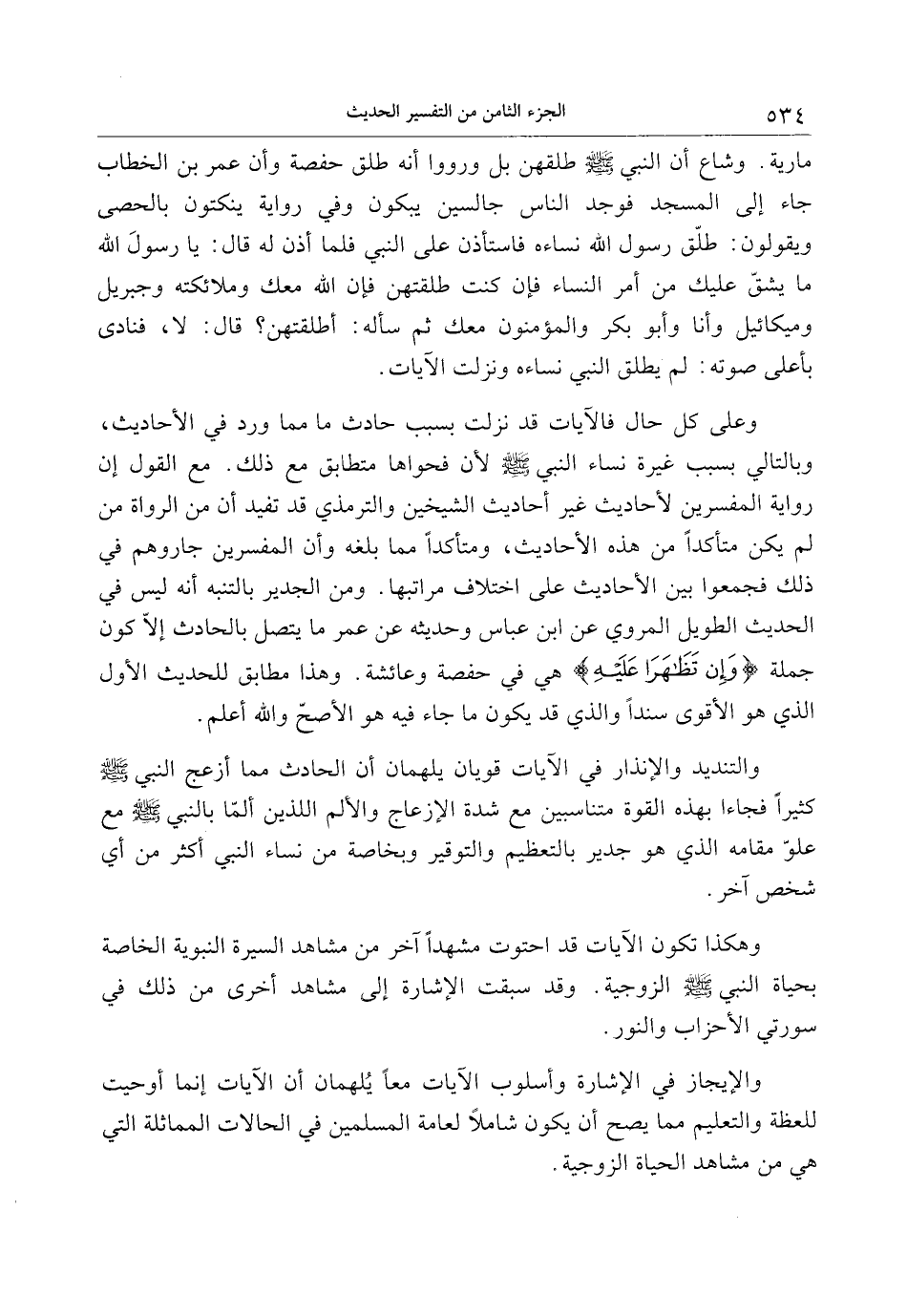 وهكذا تكون الآيات قد احتوت مشهدا آخر من مشاهد السيرة النبوية الخاصة بحياة النبي صلى الله عليه وسلم الزوجية. وقد سبقت الإشارة إلى مشاهد أخرى من ذلك في سورتي الأحزاب والنور.