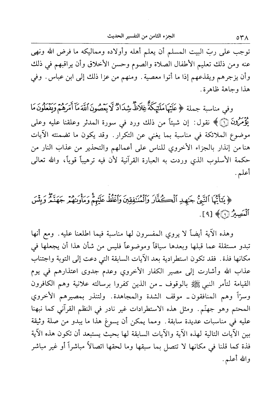 وفي مناسبة جملة عَلَيْها مَلائِكَةٌ غِلاظٌ شِدادٌ لا يَعْصُونَ اللَّهَ ما أَمَرَهُمْ وَيَفْعَلُونَ ما يُؤْمَرُونَ (6) نقول: إن شيئا من ذلك ورد في سورة المدثر وعلقنا عليه وعلى موضوع الملائكة في مناسبة بما يغني عن التكرار. وقد يكون ما تضمنته الآيات هنا من إنذار بالجزاء الأخروي للناس على أعمالهم والتحذير من عذاب النار من حكمة الأسلوب الذي وردت به العبارة القرآنية لأن فيه ترهيبا قويا، والله تعالى أعلم.