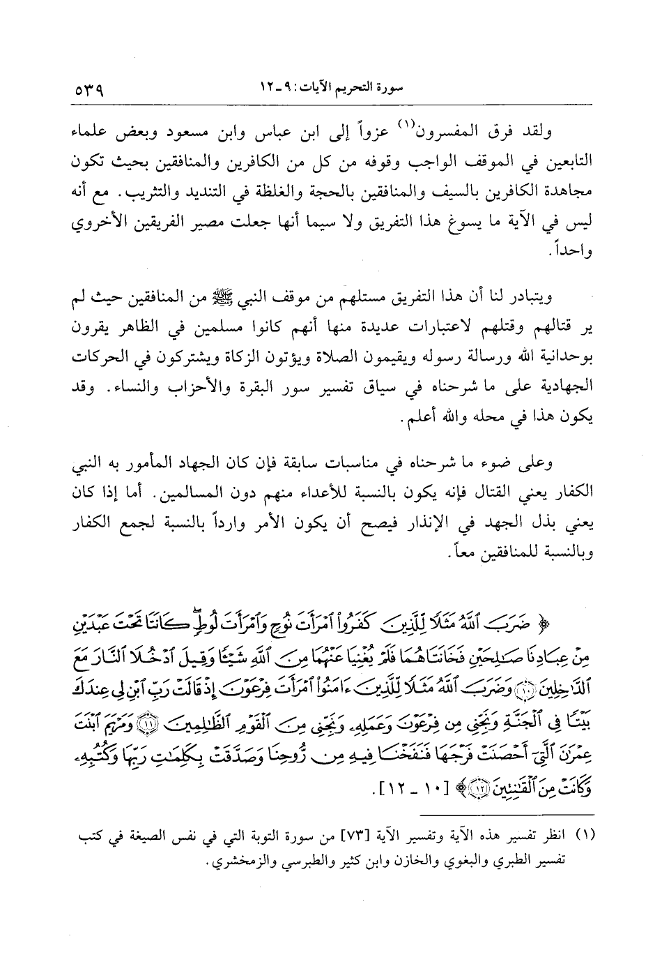 (1) انظر تفسير هذه الآية وتفسير الآية [73] من سورة التوبة التي في نفس الصيغة في كتب تفسير الطبري والبغوي والخازن وابن كثير والطبرسي والزمخشري.