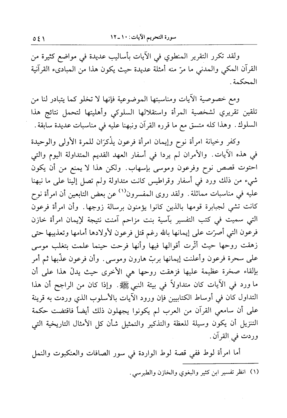 وكفر وخيانة امرأة نوح وإيمان امرأة فرعون يذكران للمرة الأولى والوحيدة في هذه الآيات. والأمران لم يردا في أسفار العهد القديم المتداولة اليوم والتي احتوت قصص نوح وفرعون وموسى بإسهاب. ولكن هذا لا يمنع من أن يكون شيء من ذلك ورد في أسفار وقراطيس كانت متداولة ولم تصل إلينا على ما نبهنا عليه في مناسبات مماثلة. ولقد روى المفسرون «1» عن بعض التابعين أن امرأة نوح كانت تشي لجبابرة قومها بالذين كانوا يؤمنون برسالة زوجها. وأن امرأة فرعون التي سميت في كتب التفسير بآسية بنت مزاحم آمنت نتيجة لإيمان امرأة خازن فرعون التي أصرّت على إيمانها بالله رغم قتل فرعون لأولادها أمامها وتعذيبها حتى زهقت روحها حيث أثّرت أقوالها فيها وأنها فرحت حينما علمت بتغلب موسى على سحرة فرعون وأعلنت إيمانها بربّ هارون وموسى. وأن فرعون عذّبها ثم أمر بإلقاء صخرة عظيمة عليها فزهقت روحها هي الأخرى حيث يدلّ هذا على أن ما ورد في الآيات كان متداولا في بيئة النبي صلى الله عليه وسلم. وإذا كان من الراجح أن هذا التداول كان في أوساط الكتابيين فإن ورود الآيات بالأسلوب الذي وردت به قرينة على أن سامعي القرآن من العرب لم يكونوا يجهلون ذلك أيضا فاقتضت حكمة التنزيل أن يكون وسيلة للعظة والتذكير والتمثيل شأن كل الأمثال التاريخية التي وردت في القرآن.