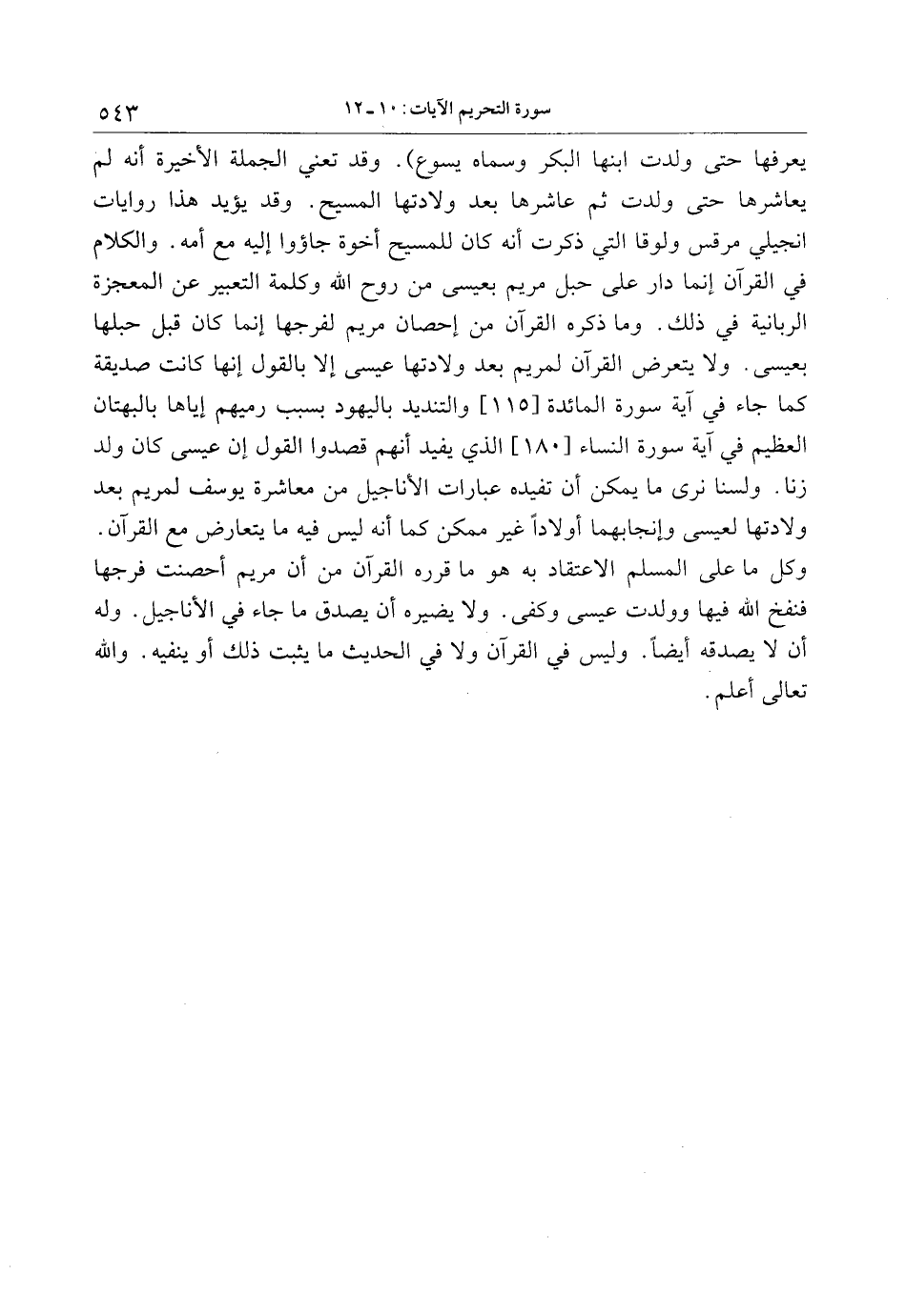 يعرفها حتى ولدت ابنها البكر وسماه يسوع) . وقد تعني الجملة الأخيرة أنه لم يعاشرها حتى ولدت ثم عاشرها بعد ولادتها المسيح. وقد يؤيد هذا روايات انجيلي مرقس ولوقا التي ذكرت أنه كان للمسيح أخوة جاؤوا إليه مع أمه. والكلام في القرآن إنما دار على حبل مريم بعيسى من روح الله وكلمة التعبير عن المعجزة الربانية في ذلك. وما ذكره القرآن من إحصان مريم لفرجها إنما كان قبل حبلها بعيسى. ولا يتعرض القرآن لمريم بعد ولادتها عيسى إلا بالقول إنها كانت صديقة كما جاء في آية سورة المائدة [115] والتنديد باليهود بسبب رميهم إياها بالبهتان العظيم في آية سورة النساء [180] الذي يفيد أنهم قصدوا القول إن عيسى كان ولد زنا. ولسنا نرى ما يمكن أن تفيده عبارات الأناجيل من معاشرة يوسف لمريم بعد ولادتها لعيسى وإنجابهما أولادا غير ممكن كما أنه ليس فيه ما يتعارض مع القرآن.