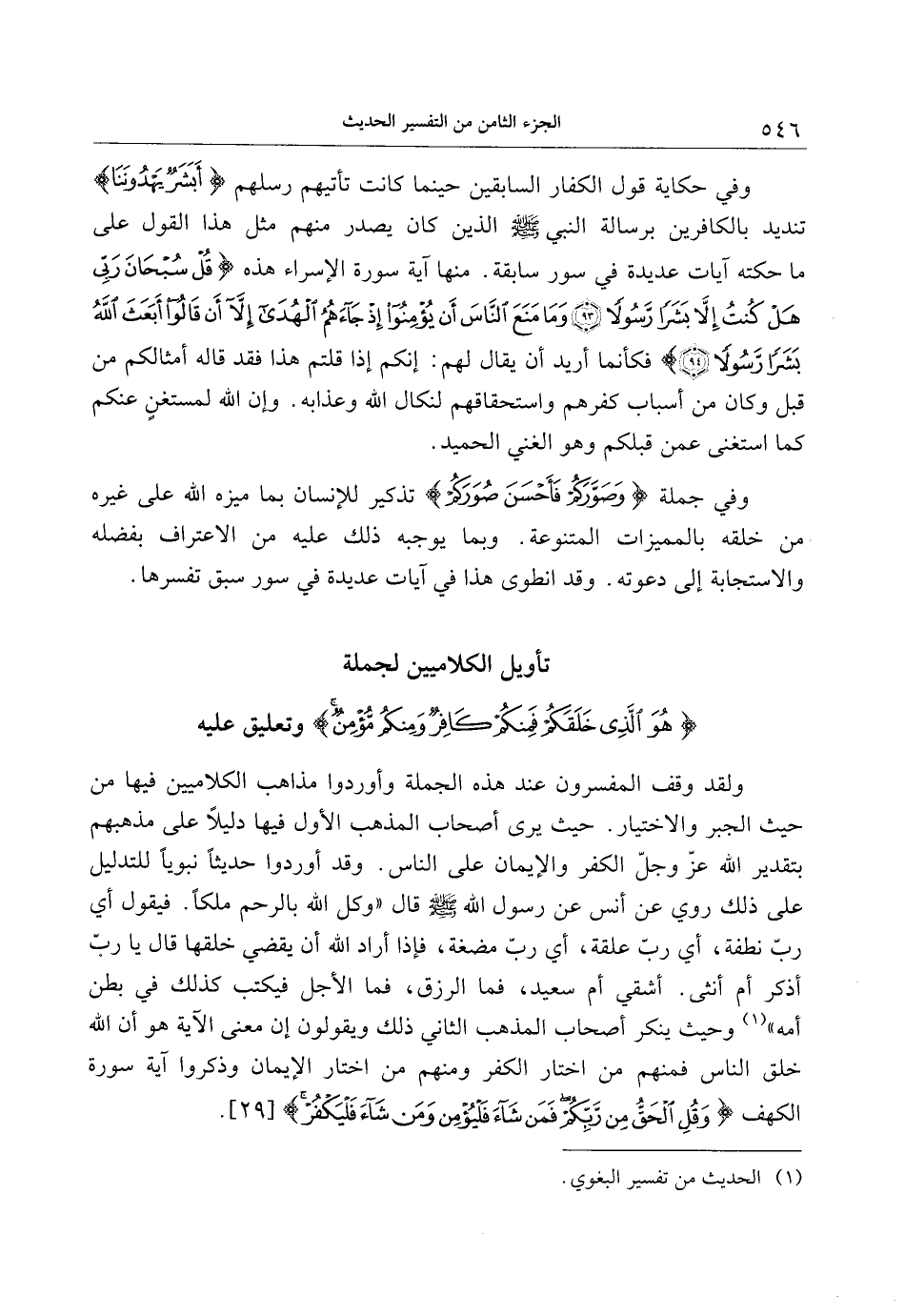 تأويل الكلاميين لجملة هُوَ الَّذِي خَلَقَكُمْ فَمِنْكُمْ كافِرٌ وَمِنْكُمْ مُؤْمِنٌ وتعليق عليه