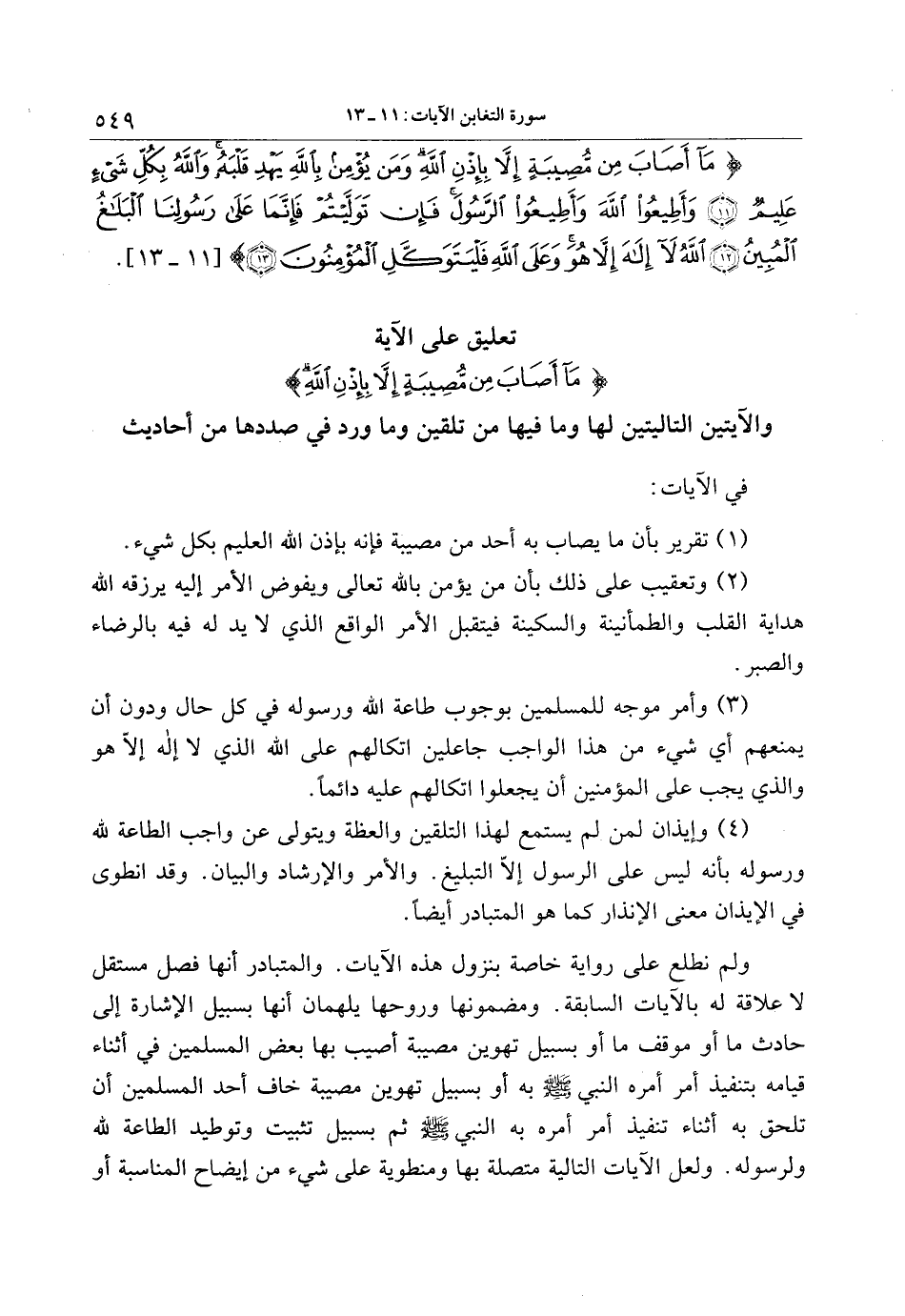 ما أَصابَ مِنْ مُصِيبَةٍ إِلاَّ بِإِذْنِ اللَّهِ وَمَنْ يُؤْمِنْ بِاللَّهِ يَهْدِ قَلْبَهُ وَاللَّهُ بِكُلِّ شَيْءٍ عَلِيمٌ (11) وَأَطِيعُوا اللَّهَ وَأَطِيعُوا الرَّسُولَ فَإِنْ تَوَلَّيْتُمْ فَإِنَّما عَلى رَسُولِنَا الْبَلاغُ الْمُبِينُ (12) اللَّهُ لا إِلهَ إِلاَّ هُوَ وَعَلَى اللَّهِ فَلْيَتَوَكَّلِ الْمُؤْمِنُونَ (13)
