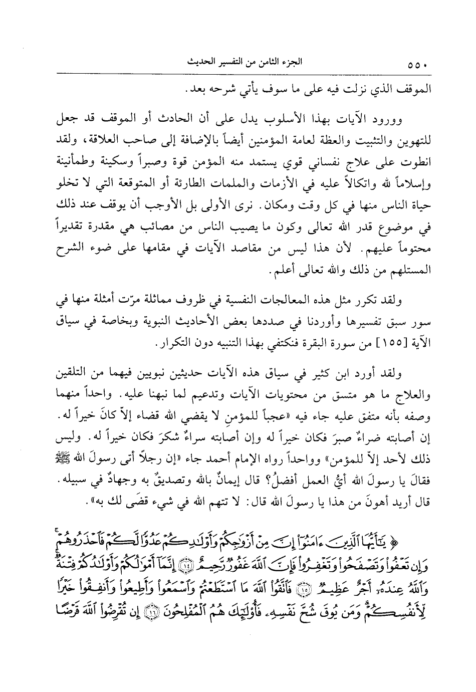 ولقد أورد ابن كثير في سياق هذه الآيات حديثين نبويين فيهما من التلقين والعلاج ما هو متسق من محتويات الآيات وتدعيم لما نبهنا عليه. واحدا منهما وصفه بأنه متفق عليه جاء فيه «عجبا للمؤمن لا يقضي الله قضاء إلّا كان خيرا له.