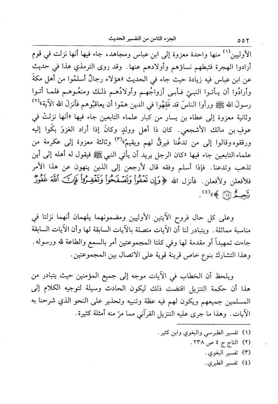 ويلحظ أن الخطاب في الآيات موجه إلى جميع المؤمنين حيث يتبادر من هذا أن حكمة التنزيل اقتضت ذلك ليكون الحادث وسيلة لتوجيه الكلام إلى المسلمين جميعهم ويكون لهم فيه عظة وتنبيه وتحذير على النحو الذي شرحنا به الآيات. وهذا ما جرى عليه التنزيل القرآني مما مرّ منه أمثلة كثيرة.
