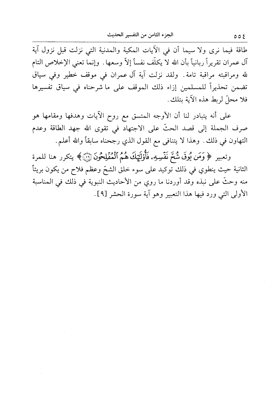 وتعبير وَمَنْ يُوقَ شُحَّ نَفْسِهِ فَأُولئِكَ هُمُ الْمُفْلِحُونَ (16) يتكرر هنا للمرة الثانية حيث ينطوي في ذلك توكيد على سوء خلق الشحّ وعظم فلاح من يكون بريئا منه وحثّ على نبذه وقد أوردنا ما روي من الأحاديث النبوية في ذلك في المناسبة الأولى التي ورد فيها هذا التعبير وهو آية سورة الحشر [9] .