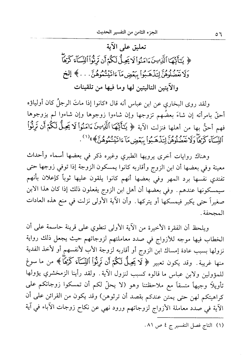 ويلحظ أن الفقرة الأخيرة من الآية الأولى تنطوي على قرينة حاسمة على أن الخطاب فيها موجه للأزواج في صدد معاملتهم لزوجاتهم حيث يجعل ذلك رواية نزولها بسبب عادة إمساك ابن الزوج أو أقاربه لزوجة الأب لأنفسهم أو لأخذ الفدية منها غريبة. وقد يكون تعبير لا يَحِلُّ لَكُمْ أَنْ تَرِثُوا النِّساءَ كَرْهاً من ما سوغ للمؤولين ولابن عباس ما قالوه كسبب لنزول الآية. ولقد رأينا الزمخشري يؤولها تأويلا وجيها متسقا مع ملاحظتنا وهو (لا يحلّ لكم أن تمسكوا زوجاتكم على كراهيتكم لهن حتى يمتن عندكم بقصد أن ترثوهن) وقد يكون من القرائن على أن الآية في صدد معاملة الأزواج لزوجاتهم ورود نهي عن نكاح زوجات الآباء في آية