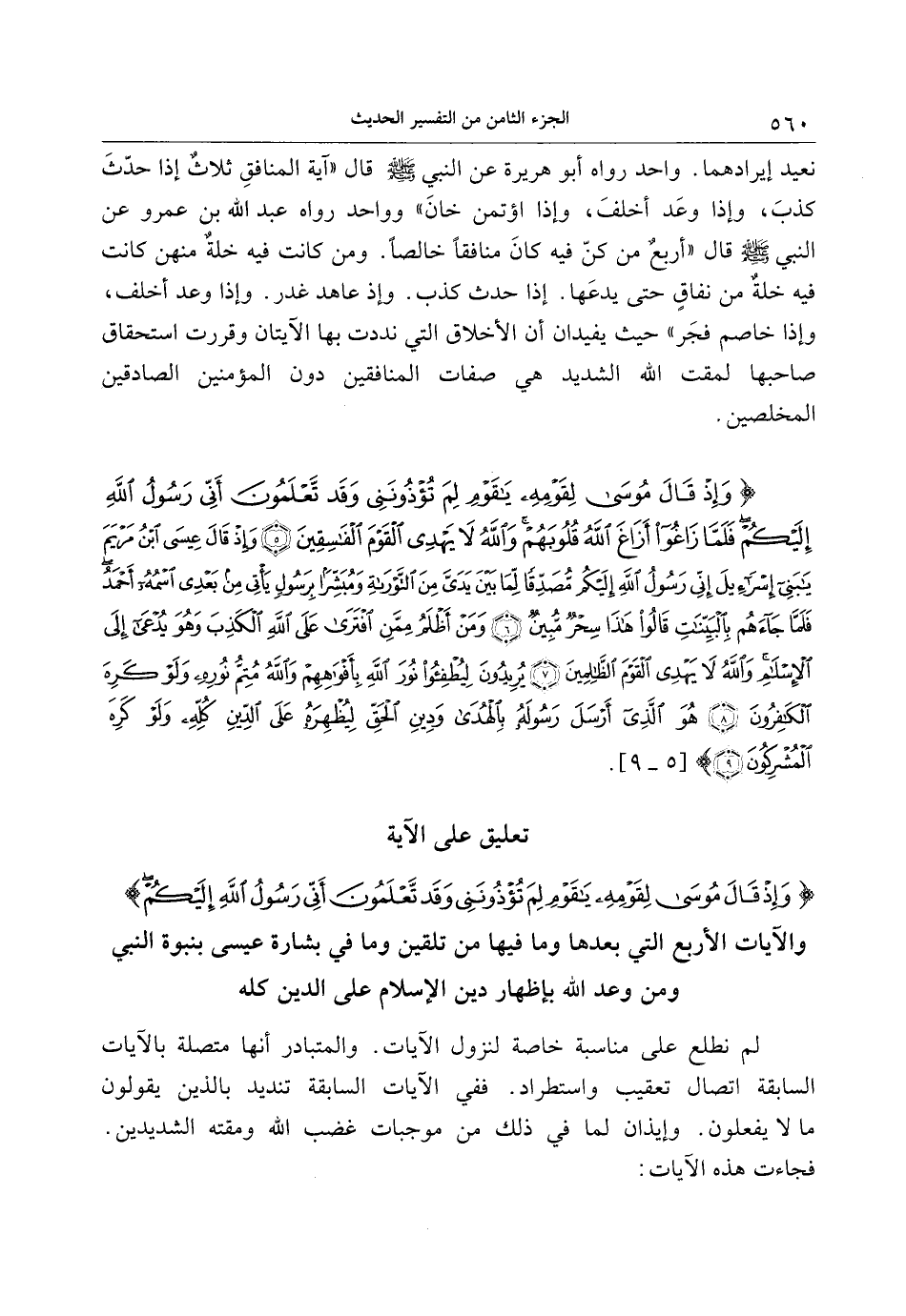 . تعليق على الآية وَإِذْ قالَ مُوسى لِقَوْمِهِ يا قَوْمِ لِمَ تُؤْذُونَنِي وَقَدْ تَعْلَمُونَ أَنِّي رَسُولُ اللَّهِ إِلَيْكُمْ والآيات الأربع التي بعدها وما فيها من تلقين وما في بشارة عيسى بنبوة النبي ومن وعد الله بإظهار دين الإسلام على الدين كله