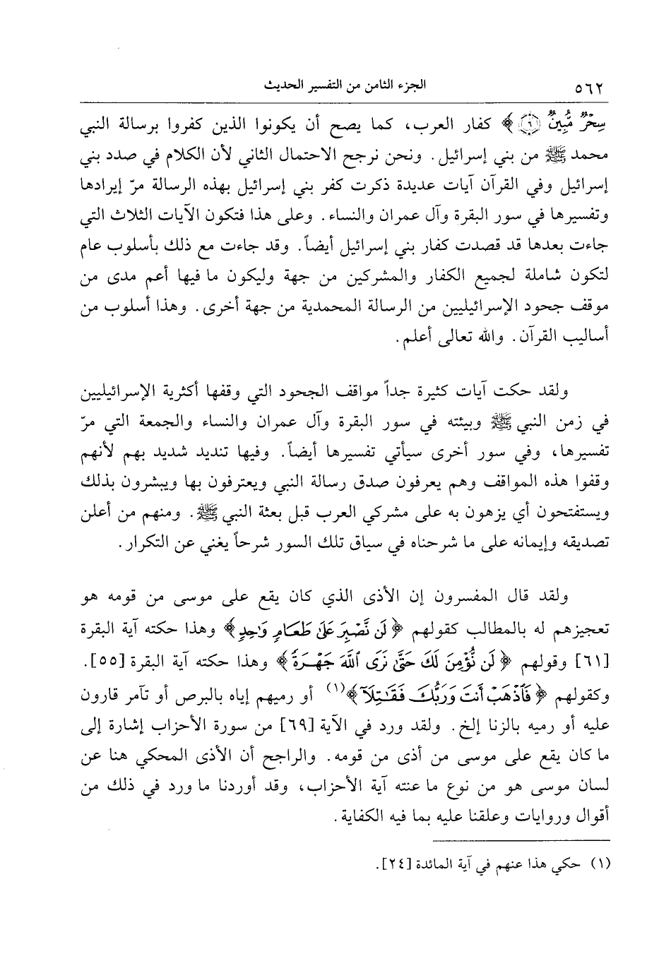 سِحْرٌ مُبِينٌ (6) كفار العرب، كما يصح أن يكونوا الذين كفروا برسالة النبي محمد صلى الله عليه وسلم من بني إسرائيل. ونحن نرجح الاحتمال الثاني لأن الكلام في صدد بني إسرائيل وفي القرآن آيات عديدة ذكرت كفر بني إسرائيل بهذه الرسالة مرّ إيرادها وتفسيرها في سور البقرة وآل عمران والنساء. وعلى هذا فتكون الآيات الثلاث التي جاءت بعدها قد قصدت كفار بني إسرائيل أيضا. وقد جاءت مع ذلك بأسلوب عام لتكون شاملة لجميع الكفار والمشركين من جهة وليكون ما فيها أعم مدى من موقف جحود الإسرائيليين من الرسالة المحمدية من جهة أخرى. وهذا أسلوب من أساليب القرآن. والله تعالى أعلم.