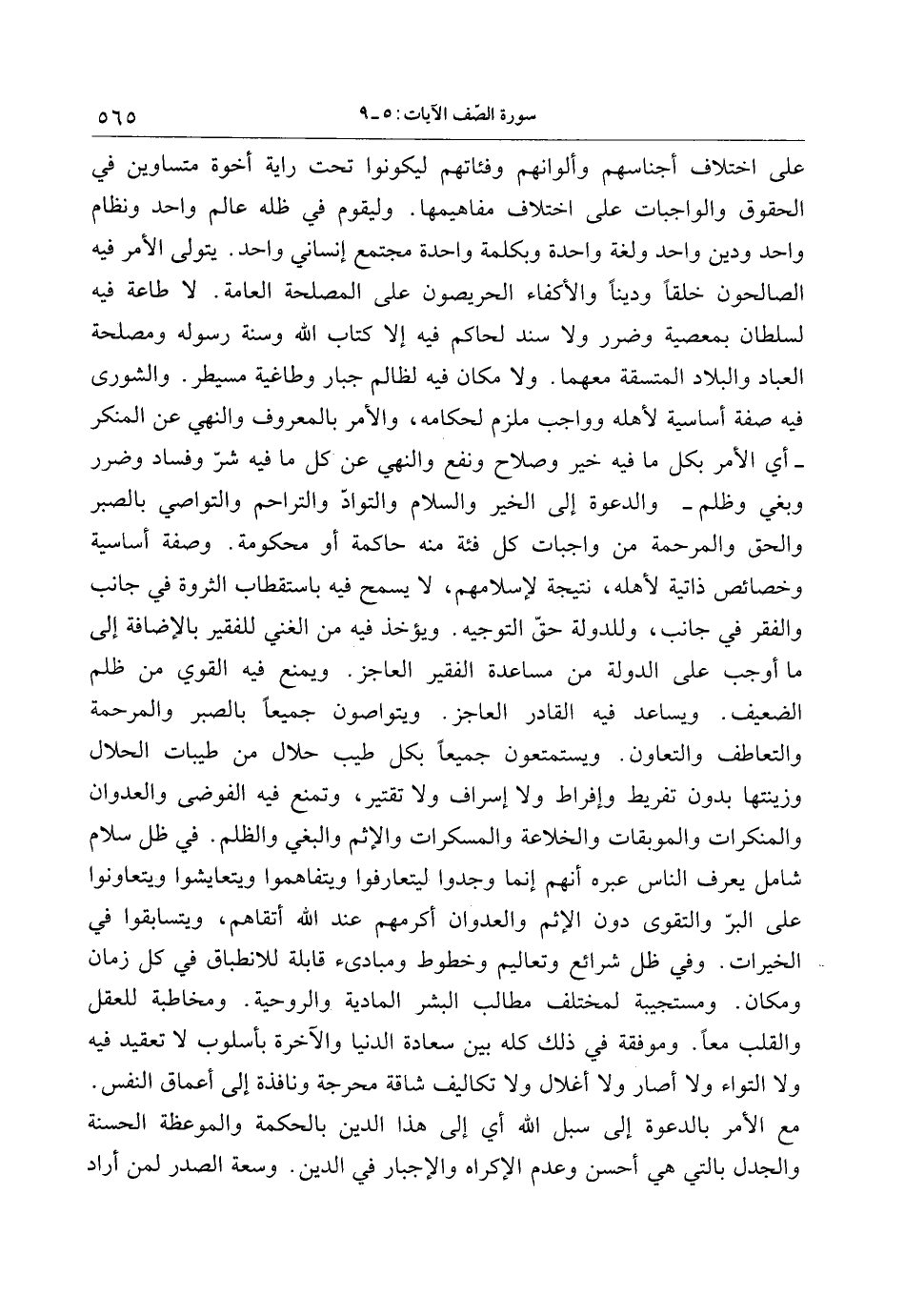على اختلاف أجناسهم وألوانهم وفئاتهم ليكونوا تحت راية أخوة متساوين في الحقوق والواجبات على اختلاف مفاهيمها. وليقوم في ظله عالم واحد ونظام واحد ودين واحد ولغة واحدة وبكلمة واحدة مجتمع إنساني واحد. يتولى الأمر فيه الصالحون خلقا ودينا والأكفاء الحريصون على المصلحة العامة. لا طاعة فيه لسلطان بمعصية وضرر ولا سند لحاكم فيه إلا كتاب الله وسنة رسوله ومصلحة العباد والبلاد المتسقة معهما. ولا مكان فيه لظالم جبار وطاغية مسيطر. والشورى فيه صفة أساسية لأهله وواجب ملزم لحكامه، والأمر بالمعروف والنهي عن المنكر- أي الأمر بكل ما فيه خير وصلاح ونفع والنهي عن كل ما فيه شرّ وفساد وضرر وبغي وظلم- والدعوة إلى الخير والسلام والتوادّ والتراحم والتواصي بالصبر والحق والمرحمة من واجبات كل فئة منه حاكمة أو محكومة. وصفة أساسية وخصائص ذاتية لأهله، نتيجة لإسلامهم، لا يسمح فيه باستقطاب الثروة في جانب والفقر في جانب، وللدولة حقّ التوجيه. ويؤخذ فيه من الغني للفقير بالإضافة إلى ما أوجب على الدولة من مساعدة الفقير العاجز. ويمنع فيه القوي من ظلم الضعيف. ويساعد فيه القادر العاجز. ويتواصون جميعا بالصبر والمرحمة والتعاطف والتعاون. ويستمتعون جميعا بكل طيب حلال من طيبات الحلال وزينتها بدون تفريط وإفراط ولا إسراف ولا تقتير، وتمنع فيه الفوضى والعدوان والمنكرات والموبقات والخلاعة والمسكرات والإثم والبغي والظلم. في ظل سلام شامل يعرف الناس عبره أنهم إنما وجدوا ليتعارفوا ويتفاهموا ويتعايشوا ويتعاونوا على البرّ والتقوى دون الإثم والعدوان أكرمهم عند الله أتقاهم، ويتسابقوا في الخيرات. وفي ظل شرائع وتعاليم وخطوط ومبادئ قابلة للانطباق في كل زمان ومكان. ومستجيبة لمختلف مطالب البشر المادية والروحية. ومخاطبة للعقل والقلب معا. وموفقة في ذلك كله بين سعادة الدنيا والآخرة بأسلوب لا تعقيد فيه ولا التواء ولا أصار ولا أغلال ولا تكاليف شاقة محرجة ونافذة إلى أعماق