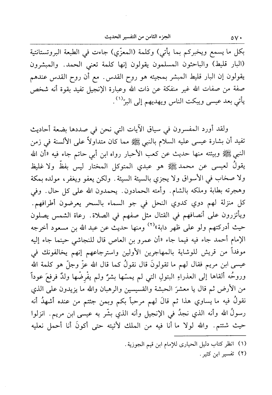 بكل ما يسمع ويخبركم بما يأتي) وكلمة (المعزّي) جاءت في الطبعة البروتستانتية (البار قليط) والباحثون المسلمون يقولون إنها كلمة تعني الحمد. والمبشرون يقولون إن البار قليط المبشر بمجيئه هو روح القدس. مع أن روح القدس عندهم صفة من صفات الله غير منفكة عن ذات الله وعبارة الإنجيل تفيد بقوة أنه شخص يأتي بعد عيسى ويبكت الناس ويهديهم إلى البرّ «1» .