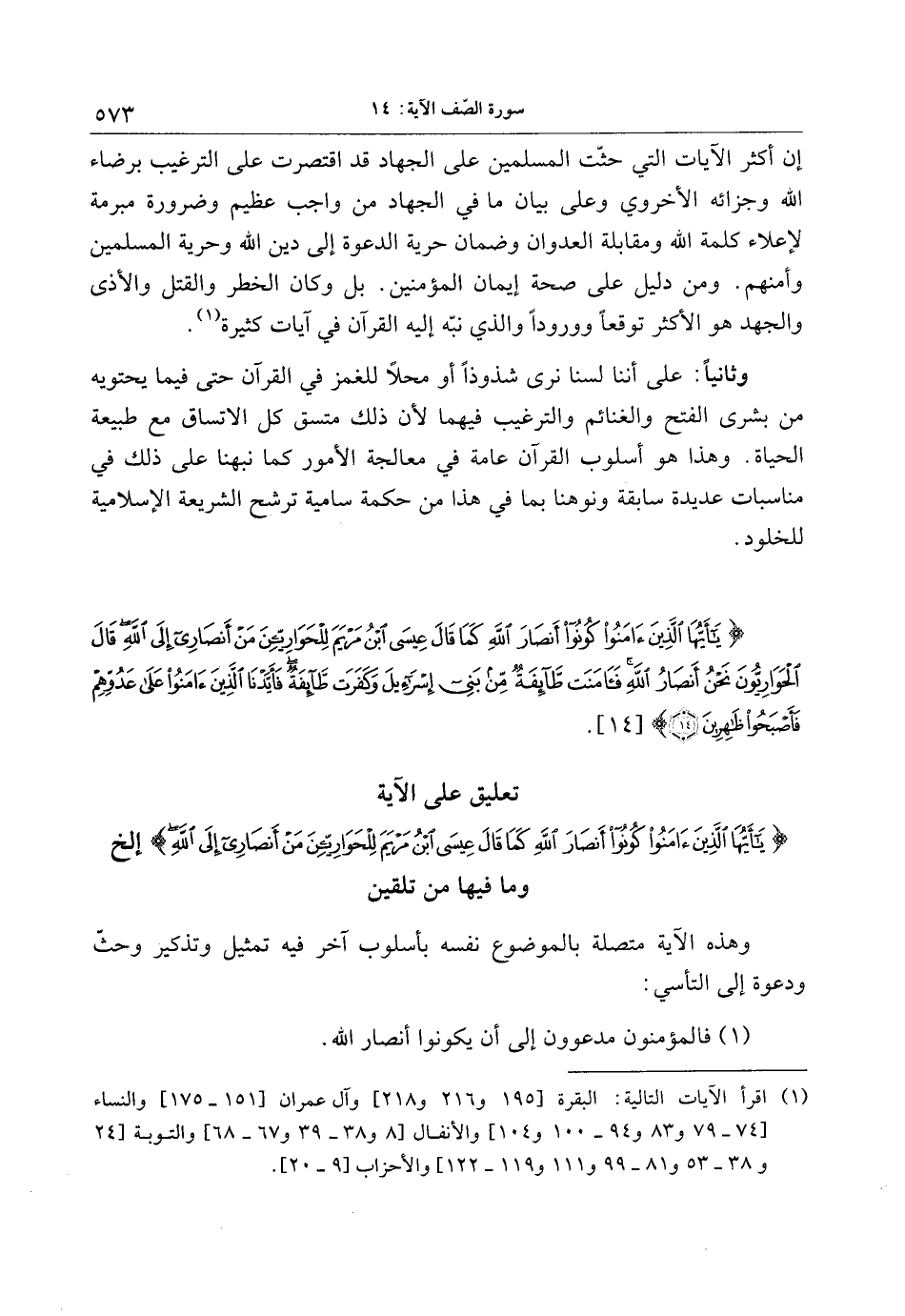 تعليق على الآية يا أَيُّهَا الَّذِينَ آمَنُوا كُونُوا أَنْصارَ اللَّهِ كَما قالَ عِيسَى ابْنُ مَرْيَمَ لِلْحَوارِيِّينَ مَنْ أَنْصارِي إِلَى اللَّهِ إلخ وما فيها من تلقين