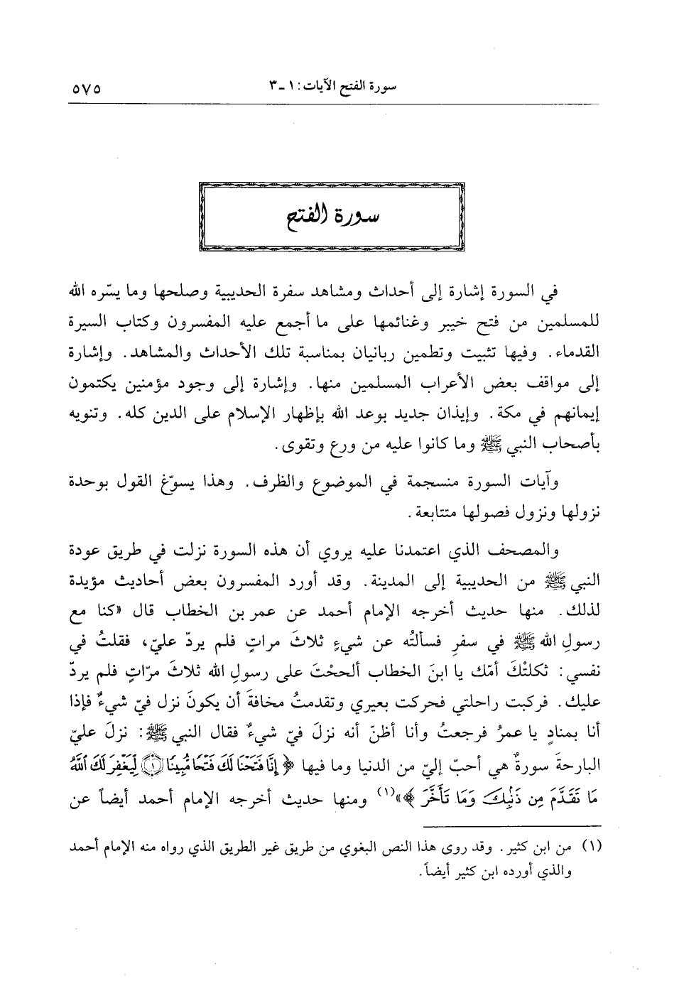 والمصحف الذي اعتمدنا عليه يروي أن هذه السورة نزلت في طريق عودة النبي صلى الله عليه وسلم من الحديبية إلى المدينة. وقد أورد المفسرون بعض أحاديث مؤيدة لذلك. منها حديث أخرجه الإمام أحمد عن عمر بن الخطاب قال «كنا مع رسول الله صلى الله عليه وسلم في سفر فسألته عن شيء ثلاث مرات فلم يردّ عليّ، فقلت في نفسي: ثكلتك أمّك يا ابن الخطاب ألححت على رسول الله ثلاث مرّات فلم يردّ عليك. فركبت راحلتي فحركت بعيري وتقدمت مخافة أن يكون نزل فيّ شيء فإذا أنا بمناد يا عمر فرجعت وأنا أظنّ أنه نزل فيّ شيء فقال النبي صلى الله عليه وسلم: نزل عليّ البارحة سورة هي أحبّ إليّ من الدنيا وما فيها إِنَّا فَتَحْنا لَكَ فَتْحاً مُبِيناً (1) لِيَغْفِرَ لَكَ اللَّهُ ما تَقَدَّمَ مِنْ ذَنْبِكَ وَما تَأَخَّرَ» «1» ومنها حديث أخرجه الإمام أحمد أيضا عن