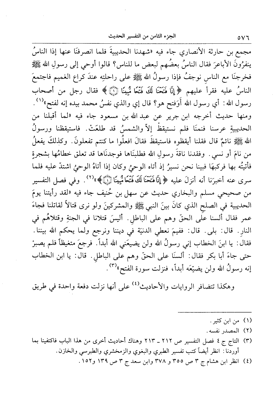 ومنها حديث أخرجه ابن جرير عن عبد الله بن مسعود جاء فيه «لما أقبلنا من الحديبية عرسنا فنمنا فلم نستيقظ إلّا والشمس قد طلعت. فاستيقظنا ورسول الله صلى الله عليه وسلم نائم قال فقلنا أيقظوه فاستيقظ فقال افعلوا ما كنتم تفعلون. وكذلك يفعل من نام أو نسي. وفقدنا ناقة رسول الله فطلبناها فوجدناها قد تعلق خطامها بشجرة فأتيته بها فركبها فبينا نحن نسير إذ أتاه الوحي وكان إذا أتاه الوحي اشتدّ عليه فلما سرى عنه أخبرنا أنه أنزل عليه إِنَّا فَتَحْنا لَكَ فَتْحاً مُبِيناً (1) » «2» . وفي فصل التفسير من صحيحي مسلم والبخاري حديث عن سهل بن حنيف جاء فيه «لقد رأيتنا يوم الحديبية في الصلح الذي كان بين النبي صلى الله عليه وسلم والمشركين ولو نرى قتالا لقاتلنا فجاء عمر فقال ألسنا على الحقّ وهم على الباطل. أليس قتلانا في الجنة وقتلاهم في النار. قال: بلى. قال: ففيم نعطي الدنية في ديننا ونرجع ولما يحكم الله بيننا.