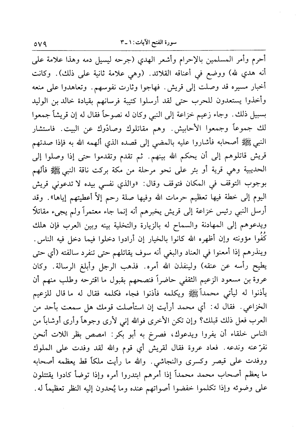 وينذرهم إذا أمعنوا في العناد والبغي أنه سوف يقاتلهم حتى تنفرد سالفته (أي حتى يطيح رأسه عن عنقه) ولينفذن الله أمره. فذهب الرجل وأبلغ الرسالة. وكان عروة بن مسعود الزعيم الثقفي حاضرا فنصحهم بقبول ما اقترحه وطلب منهم أن يأذنوا له ليأتي محمدا صلى الله عليه وسلم ويكلمه فأذنوا فجاء فكلمه فقال له ما قال للزعيم الخزاعي. فقال له: أي محمد أرأيت إن استأصلت قومك هل سمعت بأحد من العرب فعل ذلك قبلك؟ وإن تكن الأخرى فو الله إني لأرى وجوها وأرى أوشابا من الناس خلقاء أن يفروا ويدعوك، فصرخ به أبو بكر: امصص بظر اللات أنحن نفرّ عنه وندعه. فعاد عروة فقال لقريش أي قوم والله لقد وفدت على الملوك ووفدت على قيصر وكسرى والنجاشي. والله ما رأيت ملكا قط يعظمه أصحابه ما يعظم أصحاب محمد محمدا إذا أمرهم ابتدروا أمره وإذا توضأ كادوا يقتتلون على وضوئه وإذا تكلموا خفضوا أصواتهم عنده وما يحدون إليه النظر تعظيما له.