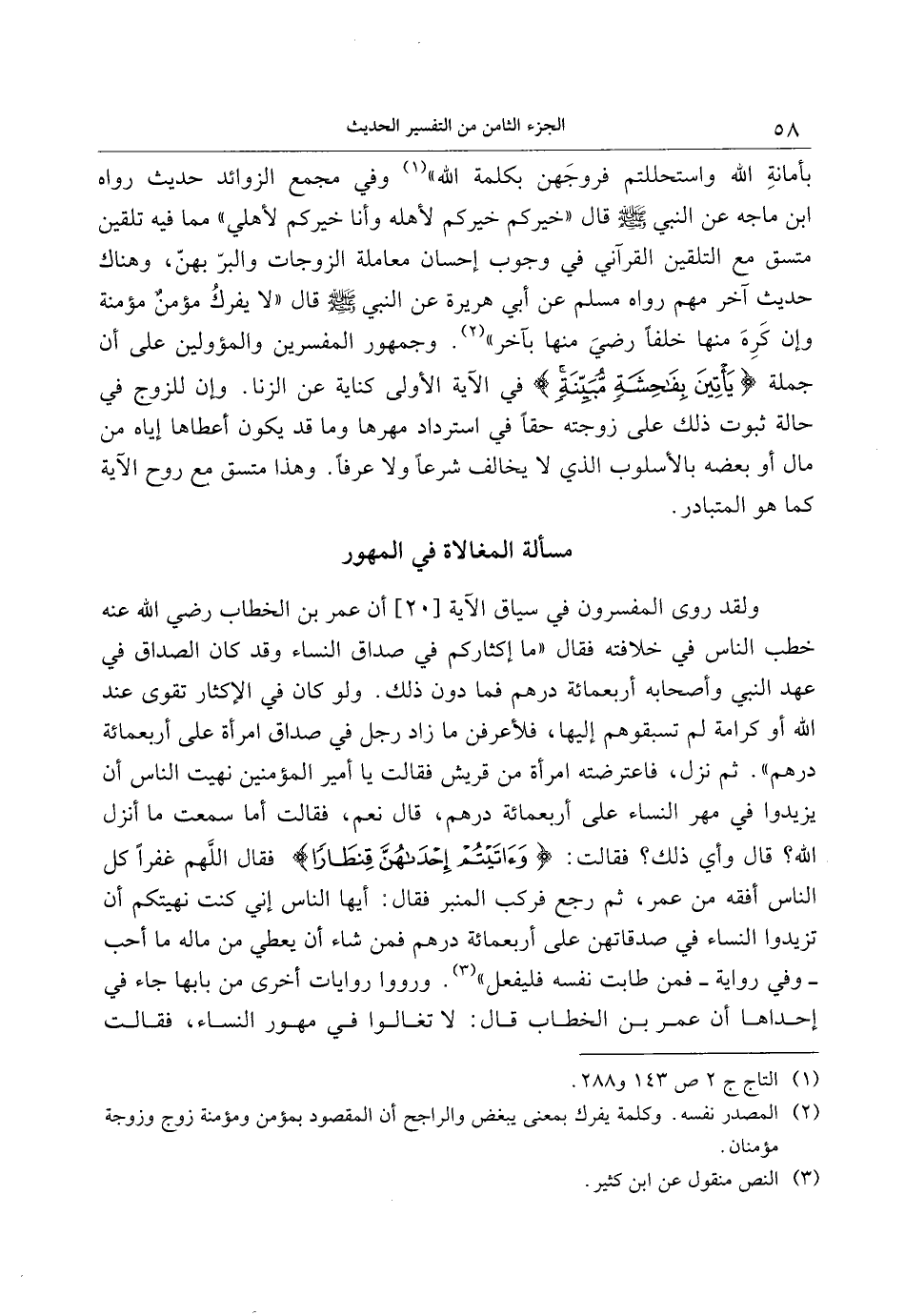 ولقد روى المفسرون في سياق الآية [20] أن عمر بن الخطاب رضي الله عنه خطب الناس في خلافته فقال «ما إكثاركم في صداق النساء وقد كان الصداق في عهد النبي وأصحابه أربعمائة درهم فما دون ذلك. ولو كان في الإكثار تقوى عند الله أو كرامة لم تسبقوهم إليها، فلأعرفن ما زاد رجل في صداق امرأة على أربعمائة درهم» . ثم نزل، فاعترضته امرأة من قريش فقالت يا أمير المؤمنين نهيت الناس أن يزيدوا في مهر النساء على أربعمائة درهم، قال نعم، فقالت أما سمعت ما أنزل الله؟ قال وأي ذلك؟ فقالت: وَآتَيْتُمْ إِحْداهُنَّ قِنْطاراً فقال اللهم غفرا كل الناس أفقه من عمر، ثم رجع فركب المنبر فقال: أيها الناس إني كنت نهيتكم أن تزيدوا النساء في صدقاتهن على أربعمائة درهم فمن شاء أن يعطي من ماله ما أحب- وفي رواية- فمن طابت نفسه فليفعل» «3» . ورووا روايات أخرى من بابها جاء في إحداها أن عمر بن الخطاب قال: لا تغالوا في مهور النساء، فقالت