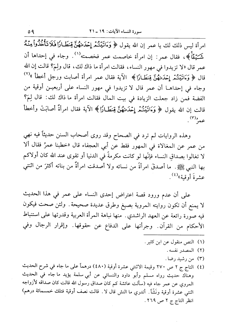 امرأة ليس ذلك لك يا عمر إن الله يقول وَآتَيْتُمْ إِحْداهُنَّ قِنْطاراً فَلا تَأْخُذُوا مِنْهُ شَيْئاً فقال عمر: إن امرأة خاصمت عمر فخصمته «1» . وجاء في إحداها أن عمر قال «لا تزيدوا في مهور النساء، فقالت امرأة ما ذاك لك، قال ولم؟ قالت إن الله قال وَآتَيْتُمْ إِحْداهُنَّ قِنْطاراً الآية فقال عمر امرأة أصابت ورجل أخطأ» «2» وجاء في إحداها أن عمر قال لا تزيدوا في مهور النساء على أربعين أوقية من الفضة فمن زاد جعلت الزيادة في بيت المال فقالت امرأة ما ذاك لك: قال لم؟