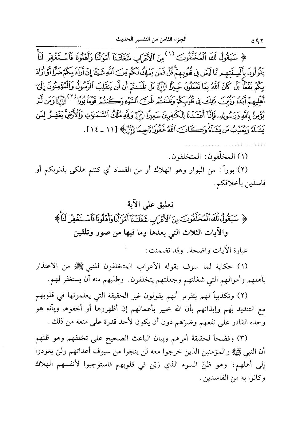 تعليق على الآية سَيَقُولُ لَكَ الْمُخَلَّفُونَ مِنَ الْأَعْرابِ شَغَلَتْنا أَمْوالُنا وَأَهْلُونا فَاسْتَغْفِرْ لَنا والآيات الثلاث التي بعدها وما فيها من صور وتلقين