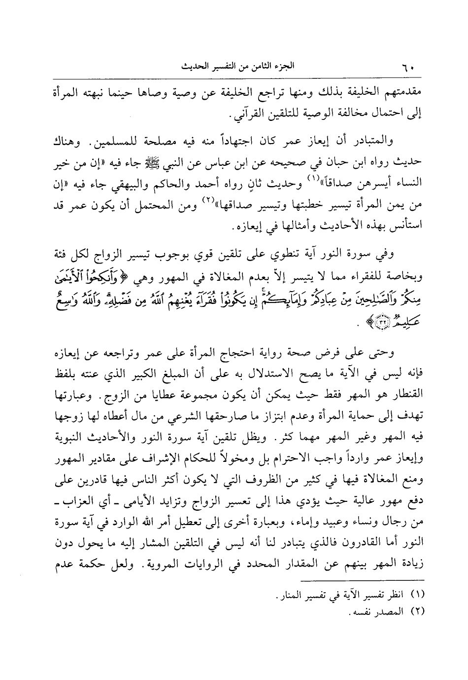 وحتى على فرض صحة رواية احتجاج المرأة على عمر وتراجعه عن إيعازه فإنه ليس في الآية ما يصح الاستدلال به على أن المبلغ الكبير الذي عنته بلفظ القنطار هو المهر فقط حيث يمكن أن يكون مجموعة عطايا من الزوج. وعبارتها تهدف إلى حماية المرأة وعدم ابتزاز ما صار حقها الشرعي من مال أعطاه لها زوجها فيه المهر وغير المهر مهما كثر. ويظل تلقين آية سورة النور والأحاديث النبوية وإيعاز عمر واردا واجب الاحترام بل ومخولا للحكام الإشراف على مقادير المهور ومنع المغالاة فيها في كثير من الظروف التي لا يكون أكثر الناس فيها قادرين على دفع مهور عالية حيث يؤدي هذا إلى تعسير الزواج وتزايد الأيامى- أي العزاب- من رجال ونساء وعبيد وإماء، وبعبارة أخرى إلى تعطيل أمر الله الوارد في آية سورة النور أما القادرون فالذي يتبادر لنا أنه ليس في التلقين المشار إليه ما يحول دون زيادة المهر بينهم عن المقدار المحدد في الروايات المروية. ولعل حكمة عدم