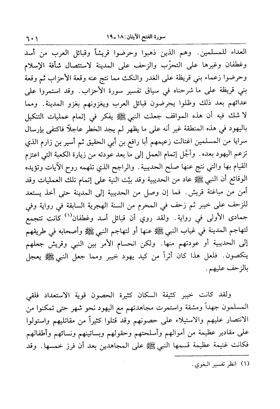 العداء للمسلمين. وهم الذين ذهبوا وحرضوا قريشا وقبائل العرب من أسد وغطفان وغيرها على التحزّب والزحف على المدينة لاستئصال شأفة الإسلام وحرضوا زعماء بني قريظة على الغدر والنكث مما نتج عنه وقعة الأحزاب ثم وقعة بني قريظة على ما شرحناه في سياق تفسير سورة الأحزاب. وقد استمروا على عدائهم بعد ذلك وظلوا يحرضون قبائل العرب ويغزونهم بغزو المدينة. ومما لا شك فيه أن هذه المواقف جعلت النبي صلى الله عليه وسلم يفكر في إتمام عمليات التنكيل باليهود في هذه المنطقة غير أنه على ما يظهر لم يجد الخطر عاجلا فاكتفى بإرسال سرايا من المسلمين اغتالت زعيمهم أبا رافع بن أبي الحقيق ثم أسير بن زارم الذي تزعم اليهود بعده. وأجّل إتمام العمل إلى ما بعد عودته من زيارة الكعبة التي اعتزم القيام بها والتي نتج عنها صلح الحديبية. والراجح الذي تلهمه روح الآيات وتؤيده الوقائع أن النبي صلى الله عليه وسلم عاد من الحديبية وقد بيّت النية على إتمام تلك العمليات وقد أمن من مباغتة قريش. فما إن وصل من الحديبية إلى المدينة حتى أخذ يستعد للزحف على خيبر ثم زحف في المحرم من السنة الهجرية السابقة في رواية وفي جمادى الأولى في رواية. ولقد روي أن قبائل أسد وغطفان «1» كانت تتجمع لتهاجم المدينة في غياب النبي صلى الله عليه وسلم عنها أو لتهاجم النبي صلى الله عليه وسلم وأصحابه في طريقهم إلى الحديبية أو عودتهم منها. ولكن انحسام الأمر بين النبي وقريش جعلهم ينكصون. فلعل هذا كان أثرا من كيد يهود خيبر ومما جعل النبي صلى الله عليه وسلم يعجل بالزحف عليهم.