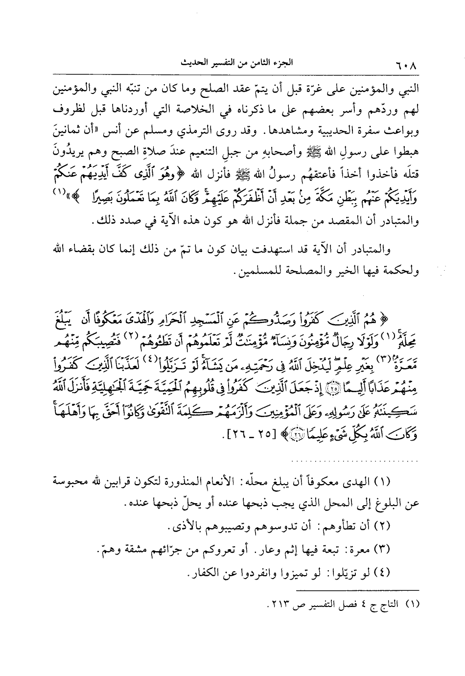 . (1) الهدى معكوفا أن يبلغ محلّه: الأنعام المنذورة لتكون قرابين لله محبوسة عن البلوغ إلى المحل الذي يجب ذبحها عنده أو يحلّ ذبحها عنده.
