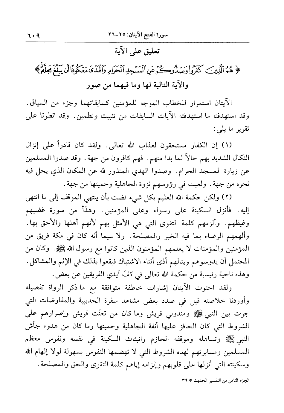 ولقد احتوت الآيتان إشارات خاطفة متوافقة مع ما ذكر الرواة تفصيله وأوردنا خلاصته قبل في صدد بعض مشاهد سفرة الحديبية والمفاوضات التي جرت بين النبي صلى الله عليه وسلم ومندوبي قريش وما كان من تعنّت قريش وإصرارهم على الشروط التي كان الحافز عليها أنفة الجاهلية وحميتها وما كان من هدوء جأش النبي صلى الله عليه وسلم وتساهله وموقفه الحازم وانبثاث السكينة في نفسه ونفوس معظم المسلمين ومسايرتهم لهذه الشروط التي لا تهضمها النفوس بسهولة لولا إلهام الله وسكينته التي أنزلها على قلوبهم وإلزامه إياهم كلمة التقوى والحق والمصلحة.