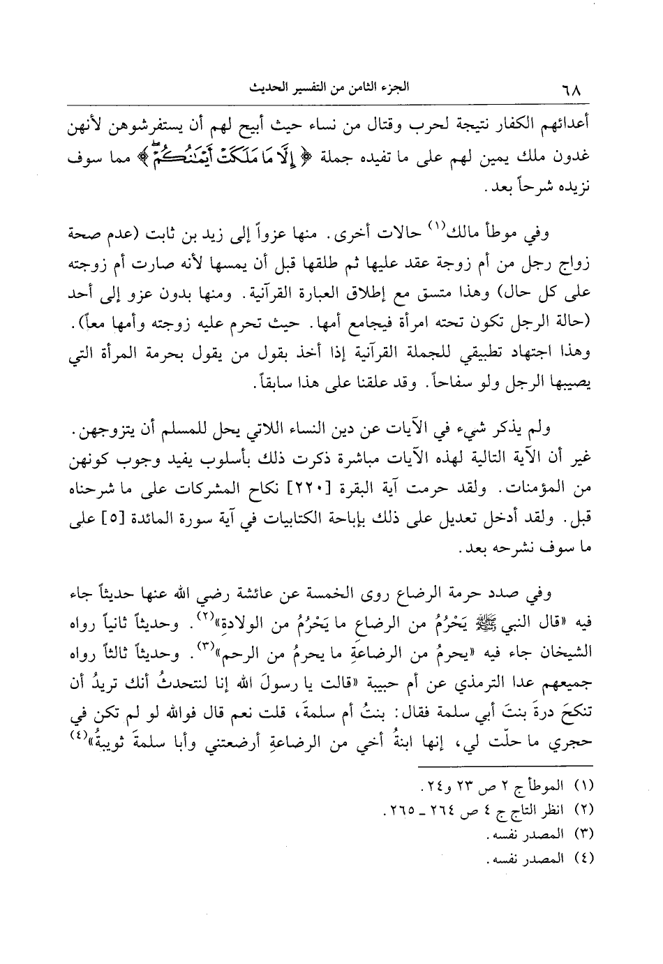 أعدائهم الكفار نتيجة لحرب وقتال من نساء حيث أبيح لهم أن يستفرشوهن لأنهن غدون ملك يمين لهم على ما تفيده جملة إِلَّا ما مَلَكَتْ أَيْمانُكُمْ مما سوف نزيده شرحا بعد.