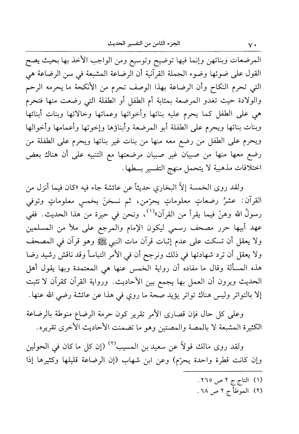 المرضعات وبناتهن وإنما فيها توضيح وتوسيع ومن الواجب الأخذ بها بحيث يصح القول على ضوئها وضوء الجملة القرآنية أن الرضاعة المشبعة في سن الرضاعة هي التي تحرم النكاح وأن الرضاعة بهذا الوصف تحرم من الأنكحة ما يحرمه الرحم والولادة حيث تغدو المرضعة بمثابة أم الطفل أو الطفلة التي رضعت منها فتحرم هي على الطفل كما يحرم عليه بناتها وأخواتها وعماتها وخالاتها وبنات أبنائها وبنات بناتها ويحرم على الطفلة أبو المرضعة وأبناؤها وإخوتها وأعمامها وأخوالها ويحرم على الطفل من رضع معه منها من بنات غير بناتها ويحرم على الطفلة من رضع معها منها من صبيان غير صبيان مرضعتها مع التنبيه على أن هناك بعض اختلافات مذهبية لا يتحمل منهج التفسير بسطها.