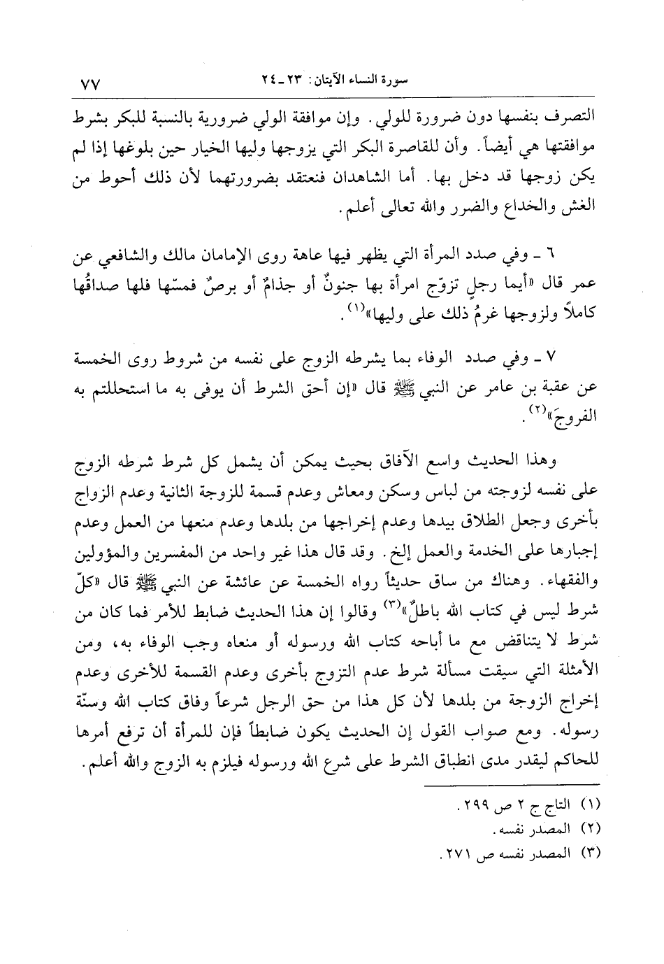 وهذا الحديث واسع الآفاق بحيث يمكن أن يشمل كل شرط شرطه الزوج على نفسه لزوجته من لباس وسكن ومعاش وعدم قسمة للزوجة الثانية وعدم الزواج بأخرى وجعل الطلاق بيدها وعدم إخراجها من بلدها وعدم منعها من العمل وعدم إجبارها على الخدمة والعمل إلخ. وقد قال هذا غير واحد من المفسرين والمؤولين والفقهاء. وهناك من ساق حديثا رواه الخمسة عن عائشة عن النبي صلى الله عليه وسلم قال «كلّ شرط ليس في كتاب الله باطل» «3» وقالوا إن هذا الحديث ضابط للأمر فما كان من شرط لا يتناقض مع ما أباحه كتاب الله ورسوله أو منعاه وجب الوفاء به، ومن الأمثلة التي سيقت مسألة شرط عدم التزوج بأخرى وعدم القسمة للأخرى وعدم إخراج الزوجة من بلدها لأن كل هذا من حق الرجل شرعا وفاق كتاب الله وسنّة رسوله. ومع صواب القول إن الحديث يكون ضابطا فإن للمرأة أن ترفع أمرها للحاكم ليقدر مدى انطباق الشرط على شرع الله ورسوله فيلزم به الزوج والله أعلم.