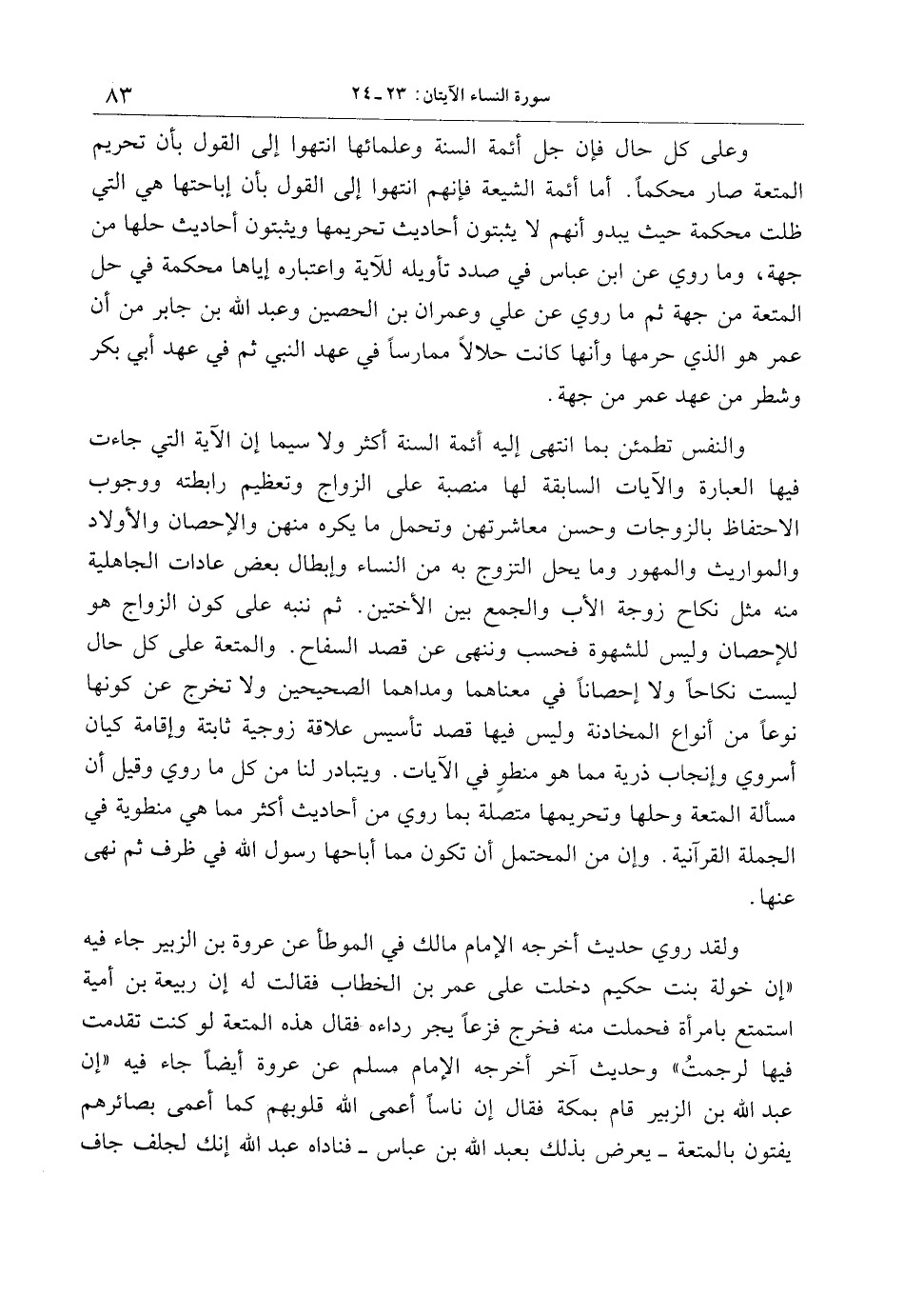 وعلى كل حال فإن جل أئمة السنة وعلمائها انتهوا إلى القول بأن تحريم المتعة صار محكما. أما أئمة الشيعة فإنهم انتهوا إلى القول بأن إباحتها هي التي ظلت محكمة حيث يبدو أنهم لا يثبتون أحاديث تحريمها ويثبتون أحاديث حلها من جهة، وما روي عن ابن عباس في صدد تأويله للآية واعتباره إياها محكمة في حل المتعة من جهة ثم ما روي عن علي وعمران بن الحصين وعبد الله بن جابر من أن عمر هو الذي حرمها وأنها كانت حلالا ممارسا في عهد النبي ثم في عهد أبي بكر وشطر من عهد عمر من جهة.