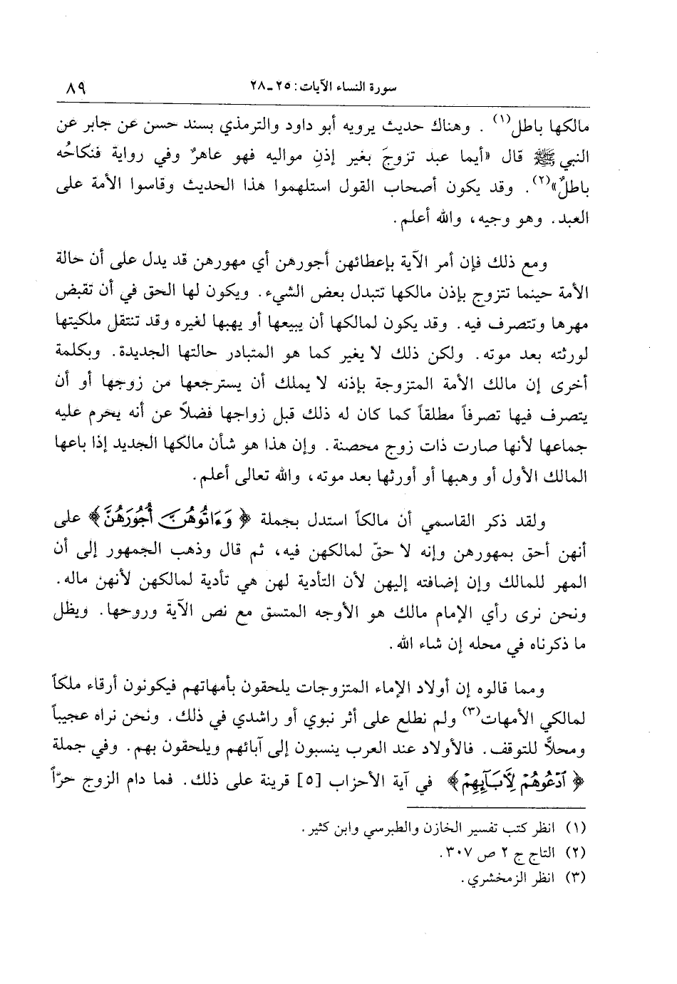 ومع ذلك فإن أمر الآية بإعطائهن أجورهن أي مهورهن قد يدل على أن حالة الأمة حينما تتزوج بإذن مالكها تتبدل بعض الشيء. ويكون لها الحق في أن تقبض مهرها وتتصرف فيه. وقد يكون لمالكها أن يبيعها أو يهبها لغيره وقد تنتقل ملكيتها لورثته بعد موته. ولكن ذلك لا يغير كما هو المتبادر حالتها الجديدة. وبكلمة أخرى إن مالك الأمة المتزوجة بإذنه لا يملك أن يسترجعها من زوجها أو أن يتصرف فيها تصرفا مطلقا كما كان له ذلك قبل زواجها فضلا عن أنه يحرم عليه جماعها لأنها صارت ذات زوج محصنة. وإن هذا هو شأن مالكها الجديد إذا باعها المالك الأول أو وهبها أو أورثها بعد موته، والله تعالى أعلم.
