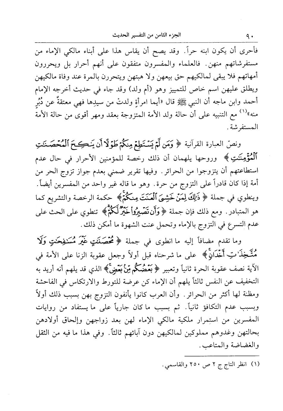 ونصّ العبارة القرآنية وَمَنْ لَمْ يَسْتَطِعْ مِنْكُمْ طَوْلًا أَنْ يَنْكِحَ الْمُحْصَناتِ الْمُؤْمِناتِ وروحها يلهمان أن ذلك رخصة للمؤمنين الأحرار في حال عدم استطاعتهم أن يتزوجوا من الحرائر. وفيها تقرير ضمني بعدم جواز تزوج الحر من أمة إذا كان قادرا على التزوج من حرة. وهو ما قاله غير واحد من المفسرين أيضا.