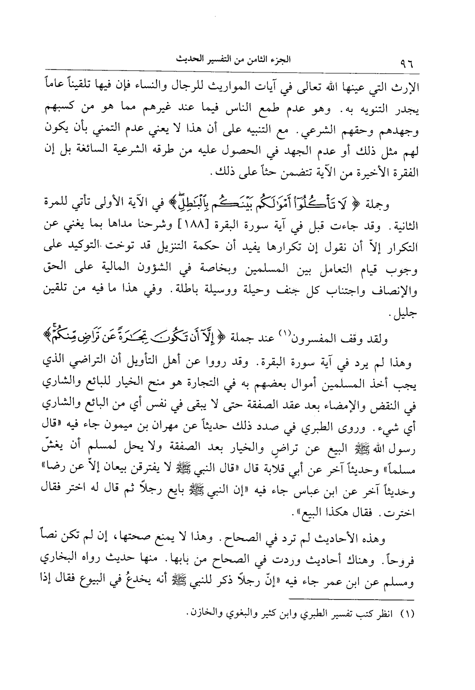 ولقد وقف المفسرون «1» عند جملة إِلَّا أَنْ تَكُونَ تِجارَةً عَنْ تَراضٍ مِنْكُمْ وهذا لم يرد في آية سورة البقرة. وقد رووا عن أهل التأويل أن التراضي الذي يجب أخذ المسلمين أموال بعضهم به في التجارة هو منح الخيار للبائع والشاري في النقض والإمضاء بعد عقد الصفقة حتى لا يبقى في نفس أي من البائع والشاري أي شيء. وروى الطبري في صدد ذلك حديثا عن مهران بن ميمون جاء فيه «قال رسول الله صلى الله عليه وسلم البيع عن تراض والخيار بعد الصفقة ولا يحل لمسلم أن يغشّ مسلما» وحديثا آخر عن أبي قلابة قال «قال النبي صلى الله عليه وسلم لا يفترقن بيعان إلّا عن رضا» وحديثا آخر عن ابن عباس جاء فيه «إن النبي صلى الله عليه وسلم بايع رجلا ثم قال له اختر فقال اخترت. فقال هكذا البيع» .